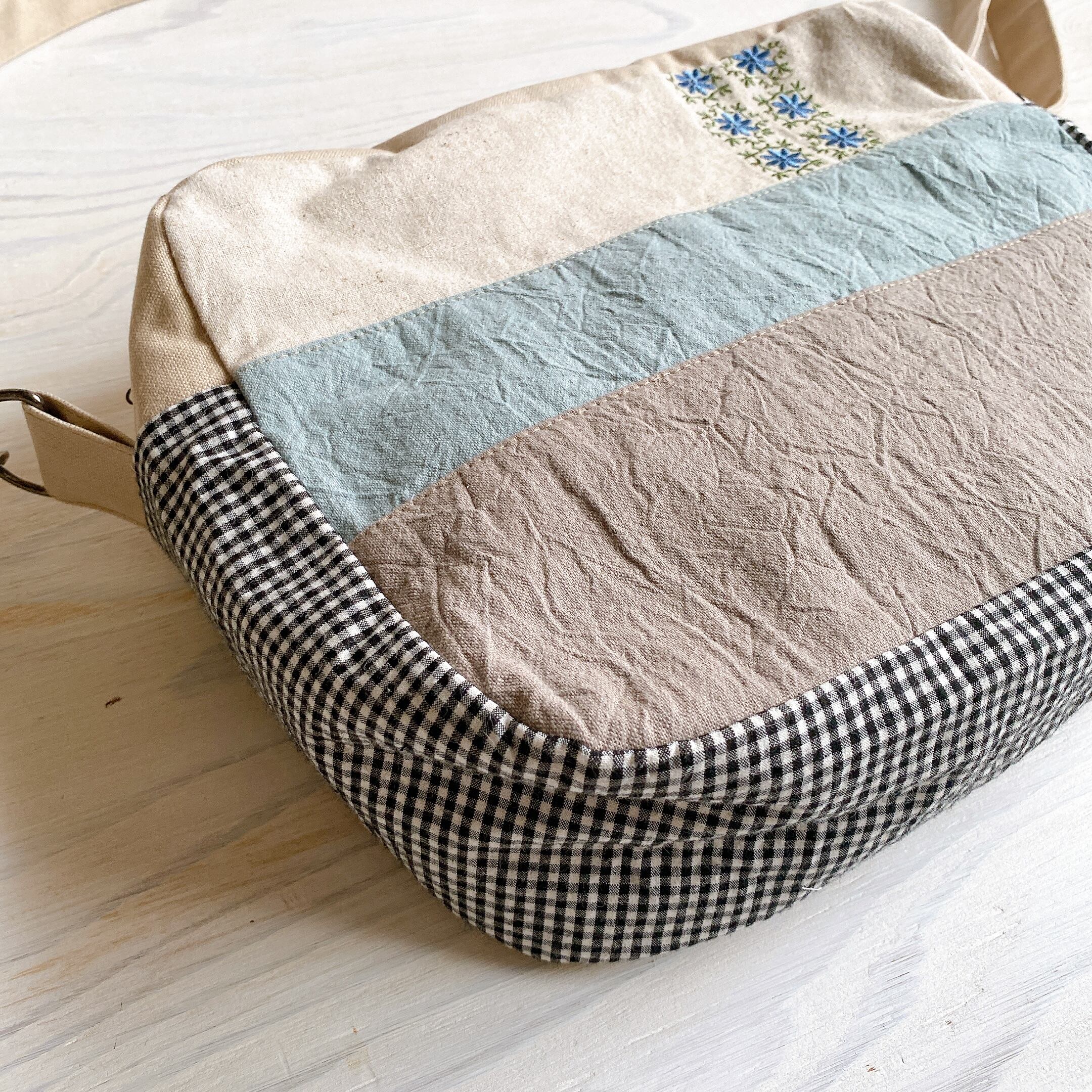 裏地は綿麻キャンバス、マチの部分はハンプの生地を使っていますのでハリがあります