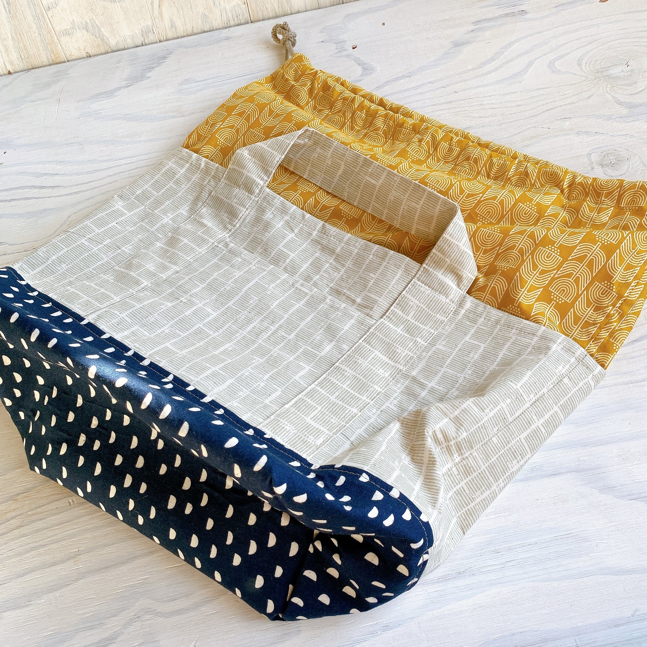 3つの生地を組み合わせて巾着付きのトートバックを作りました