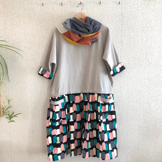 ドルマンスリーブのワンピース*グレーベージュ×ブラック