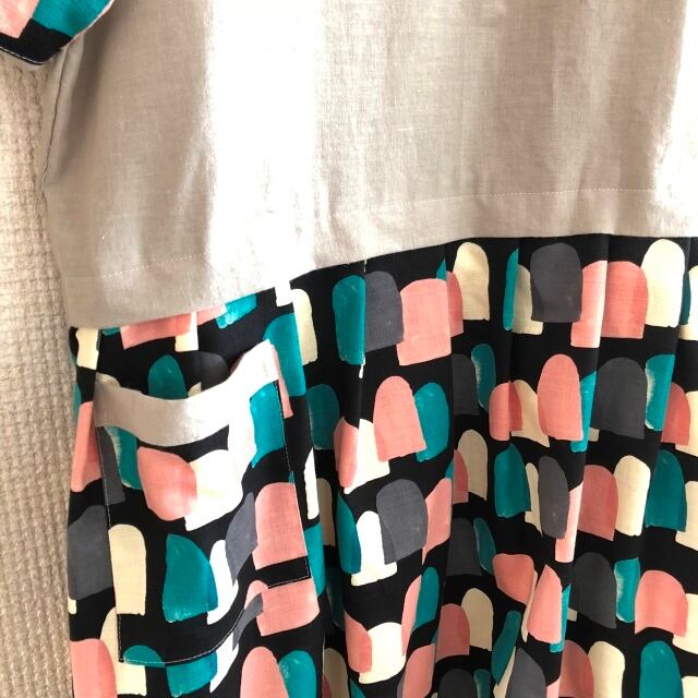 素材は、トップス部分はハーフリネン、スカート部分は綿100のバニランプリントです。