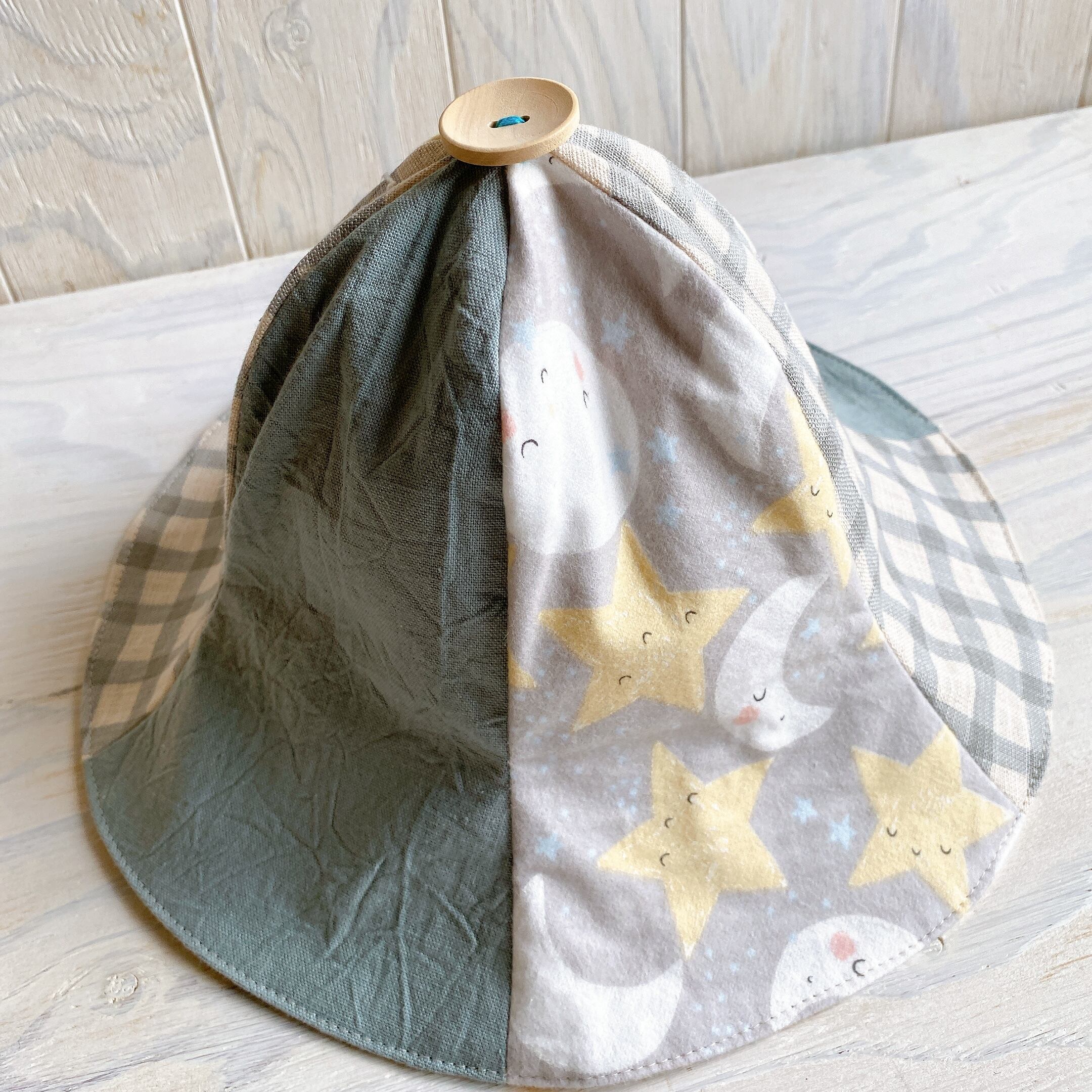 相性の良い3色の生地を組み合わせてチューリップハットにしました。