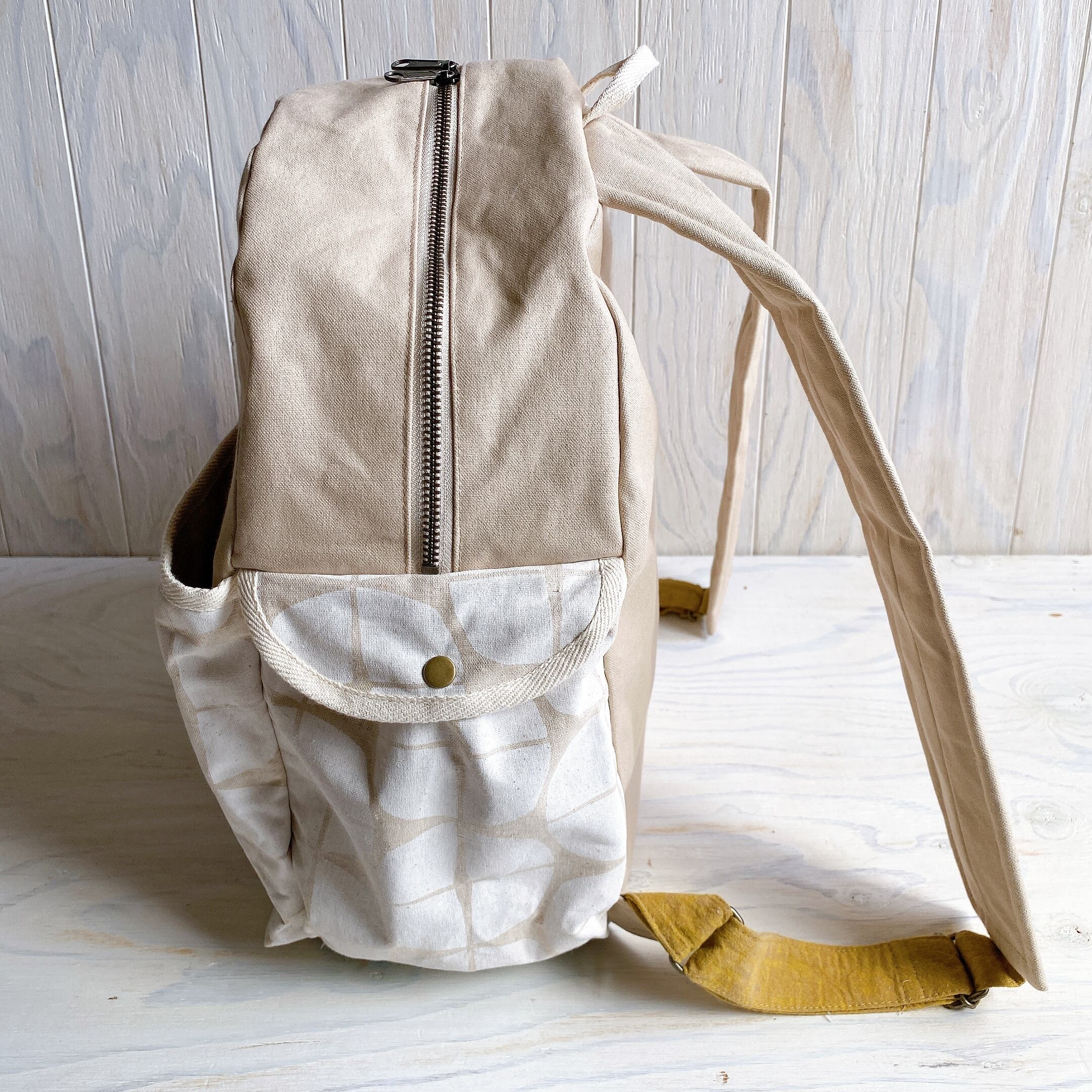 本体は弱撥水加工の8号のハンプと柄の生地は芯を張った綿麻の生地を使い、