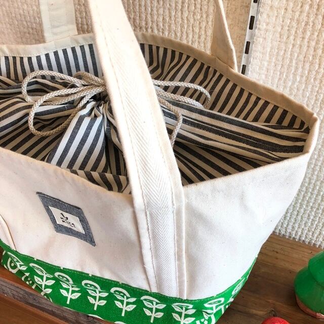 トート下部分の柄生地は綿麻キャンバスの生地に接着芯を張って強度を強めています。