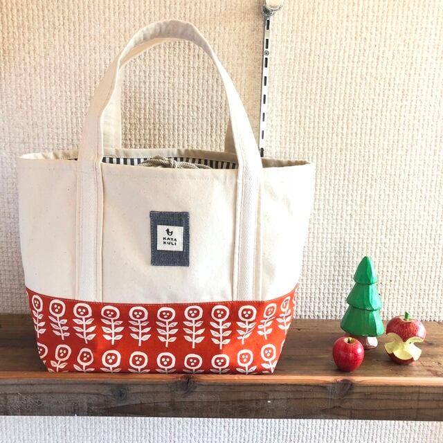トート下部分の柄生地は綿麻キャンバスの生地に接着芯を張って強度を強めています。