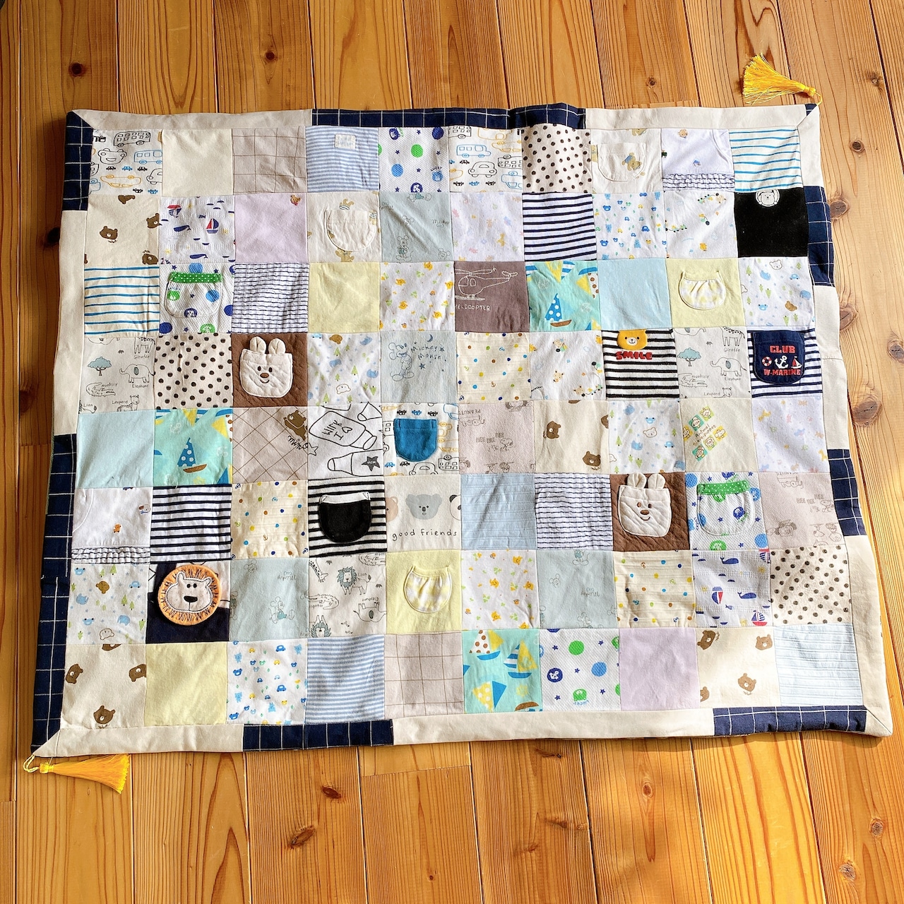 サイズアウトしたベビー服をブランケットにリメイクしました。