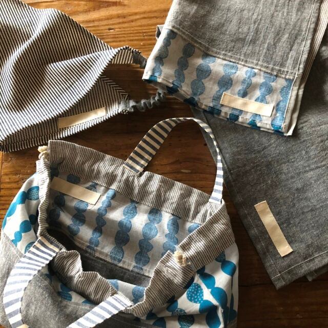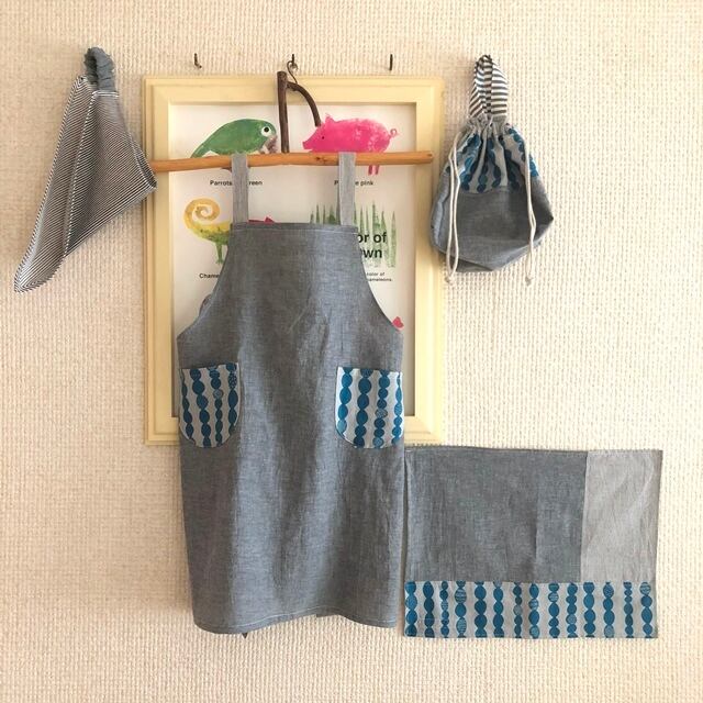 【オーダーのお品】男の子エプロン4点セット(サイズ125)青モコモコ