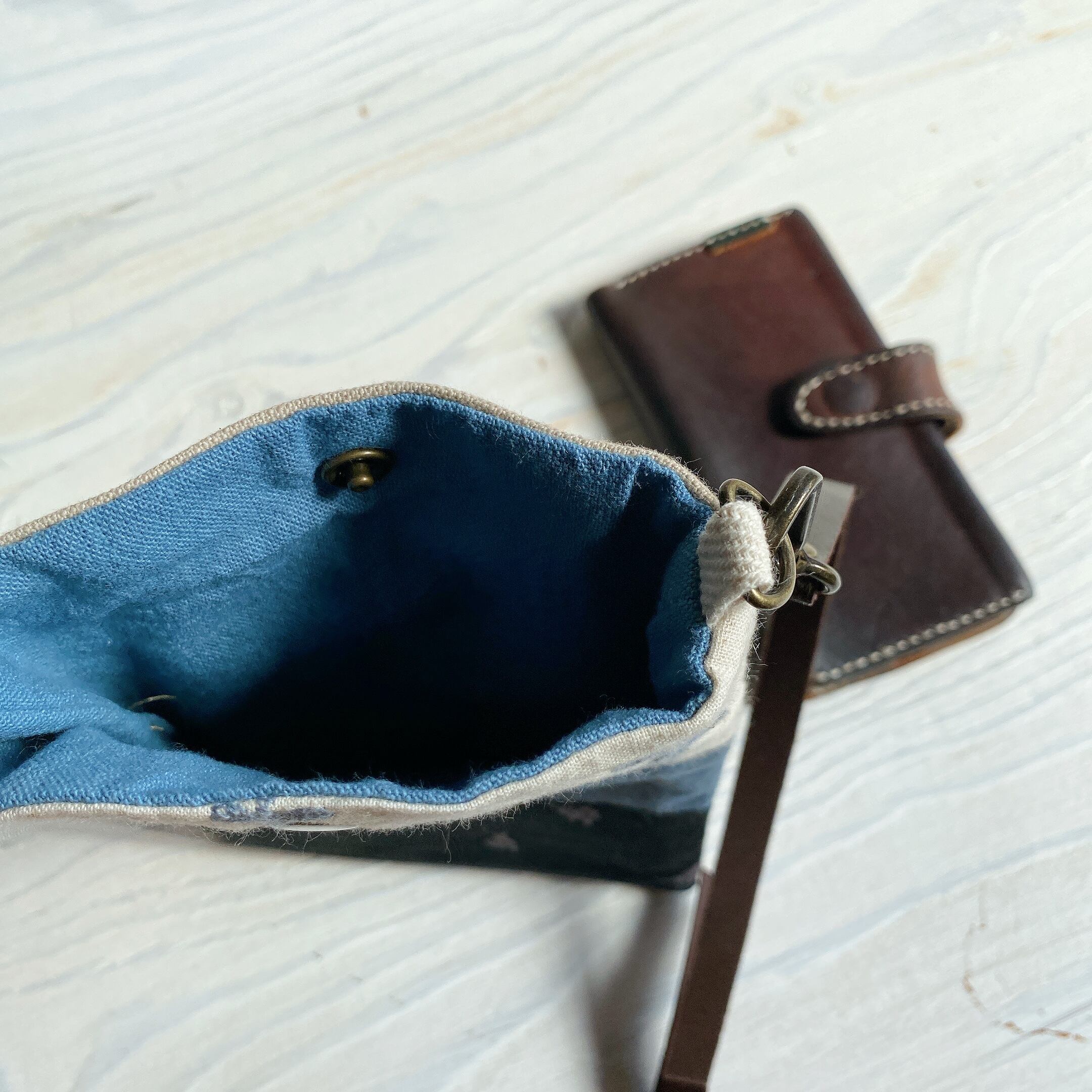入り口のスナップボタンがスマホがうっかりポーチからこぼれるのを防いでくれます。