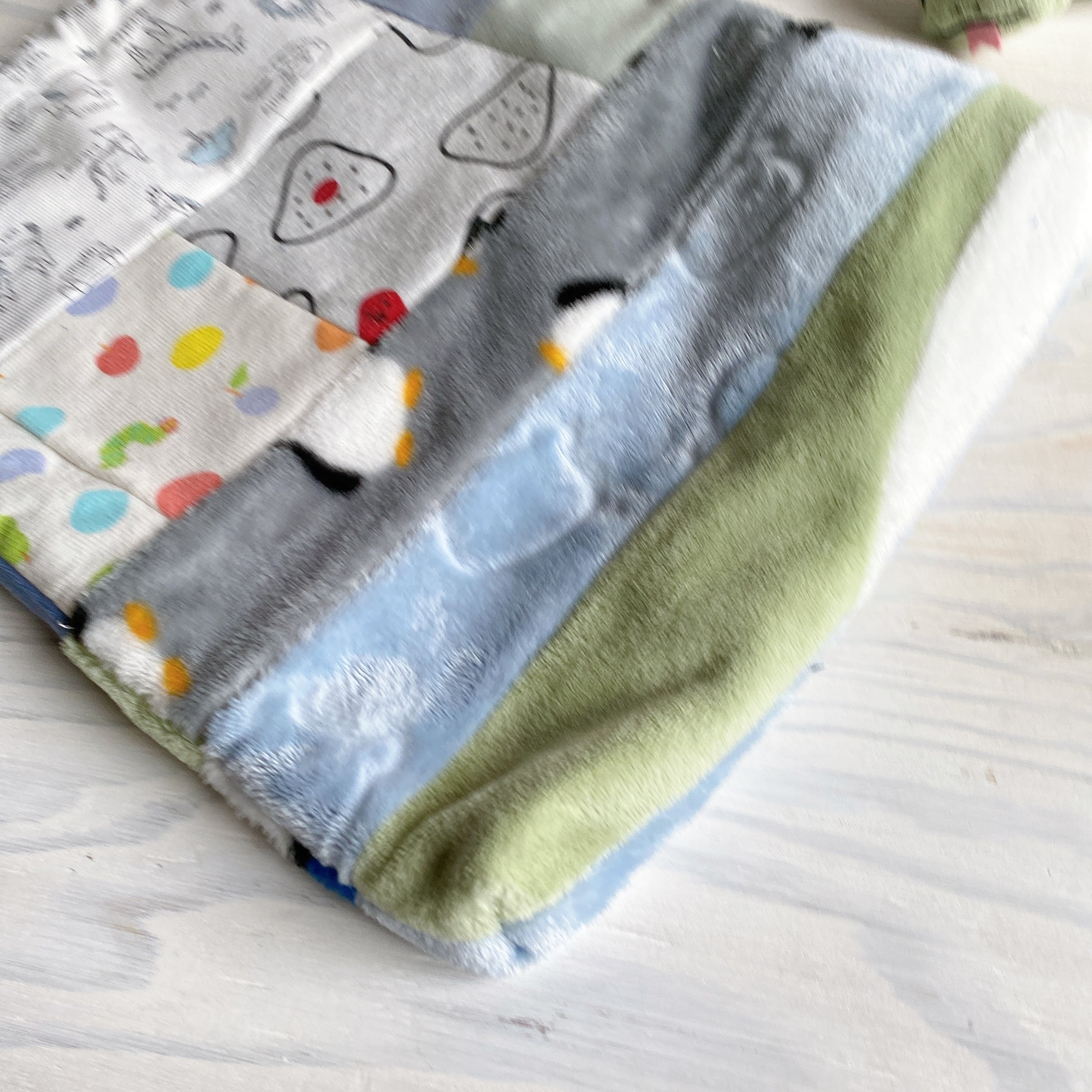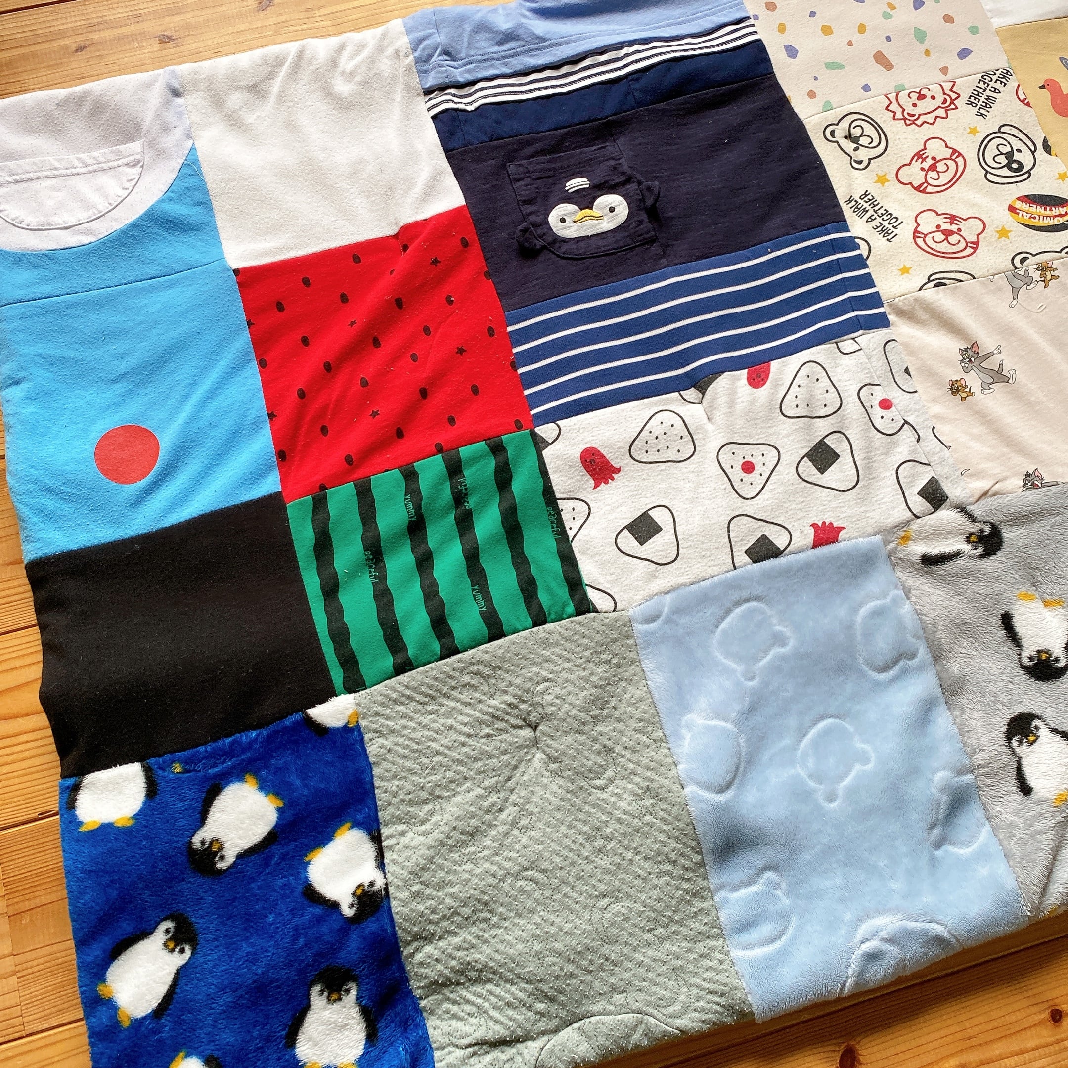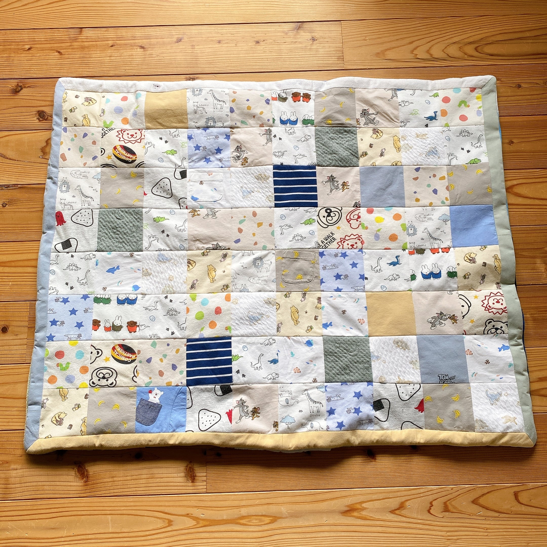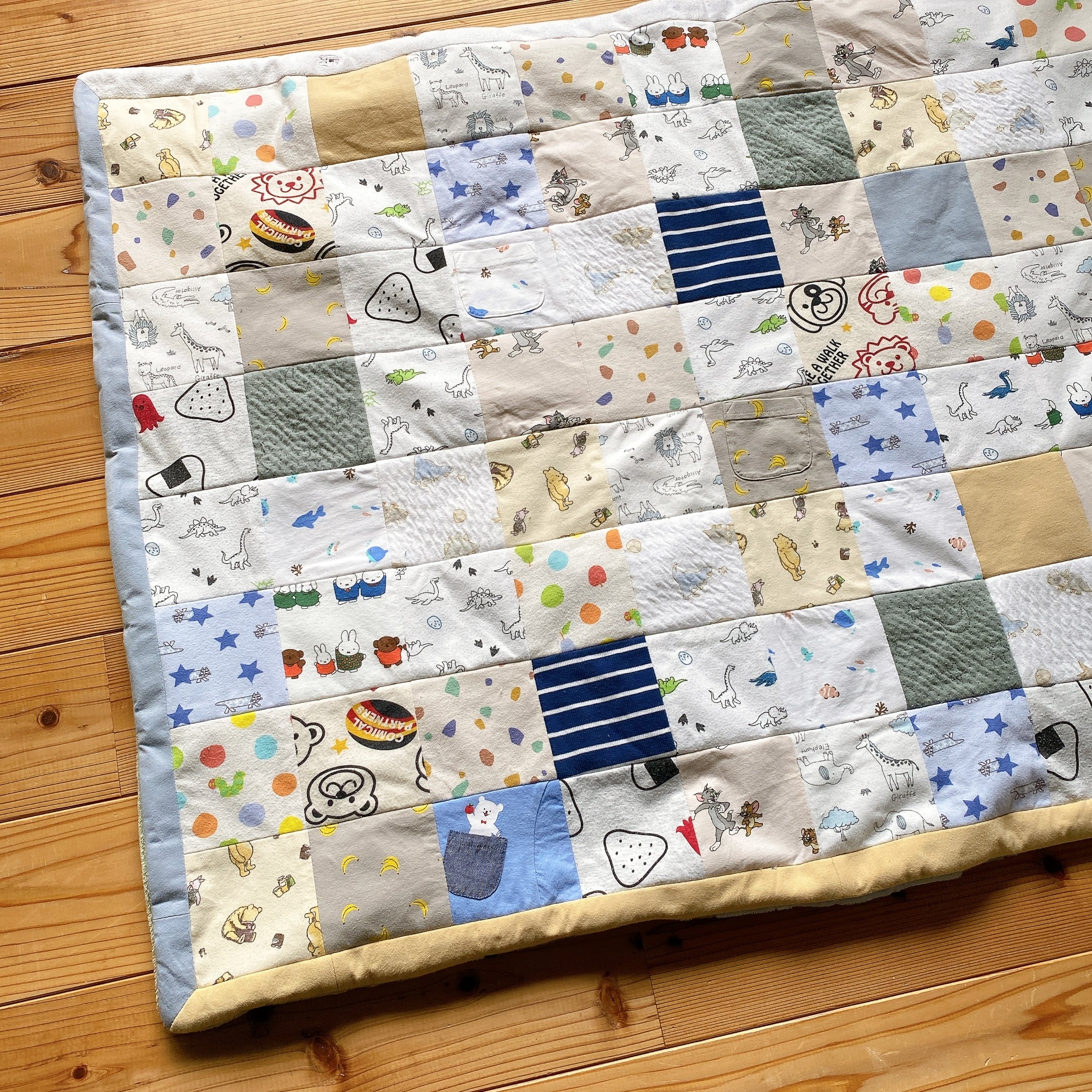 サイズアウトしたベビー服をブランケットにリメイクしました。