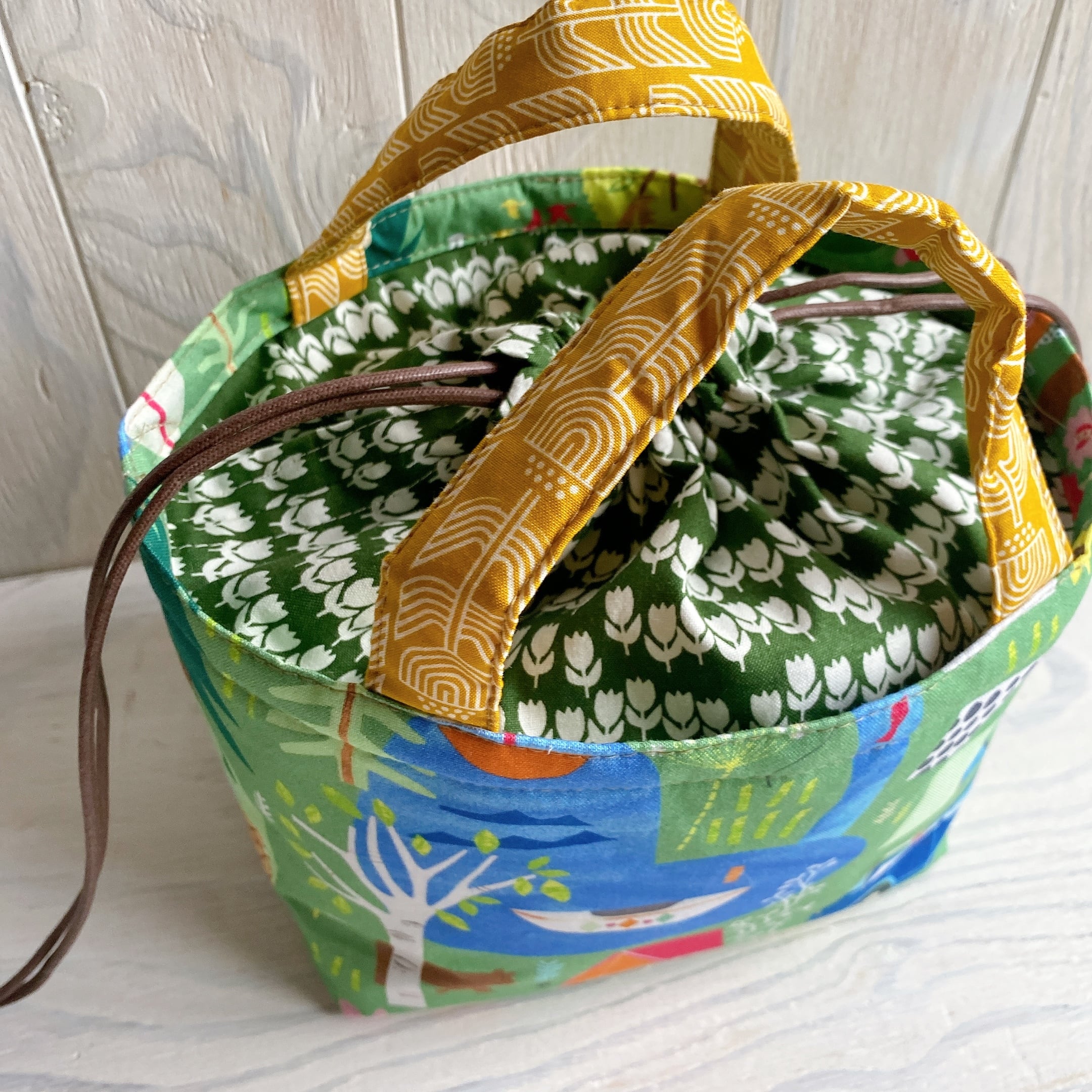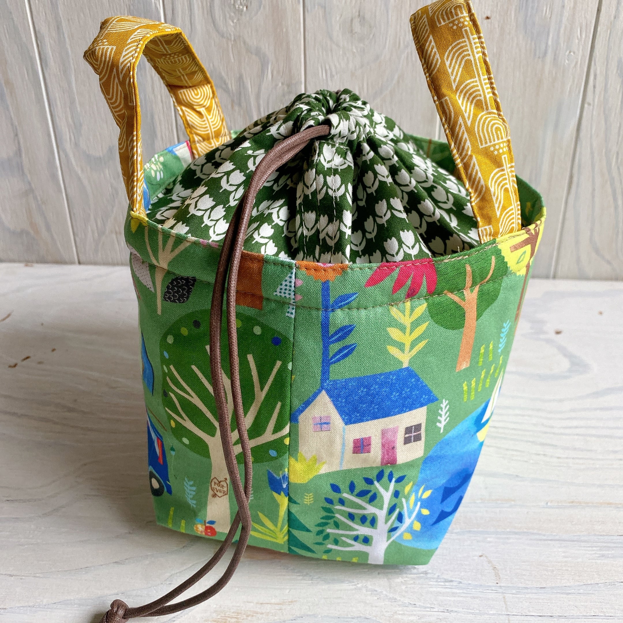 3種類の生地を組み合わせて、巾着付きのバックを作りました。
