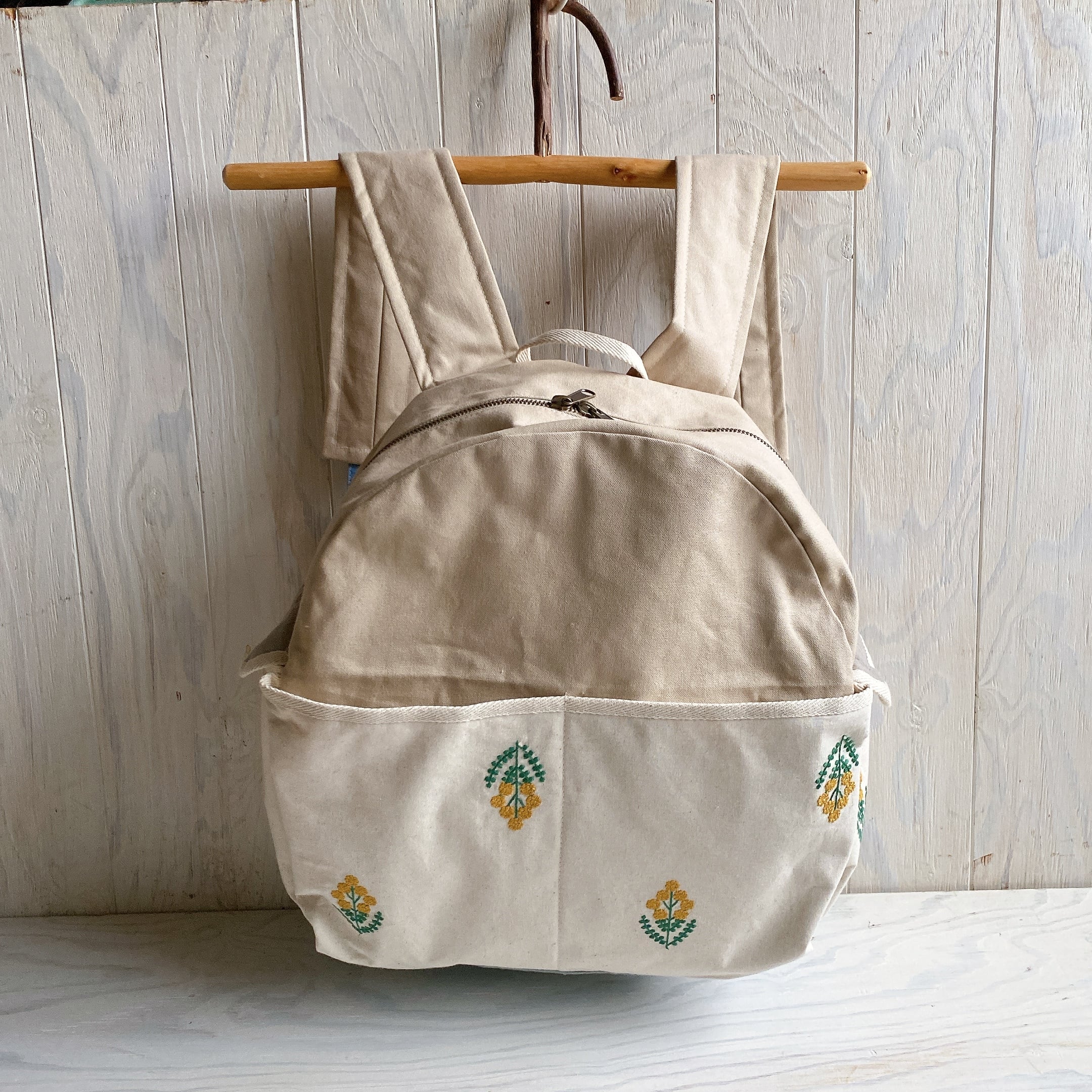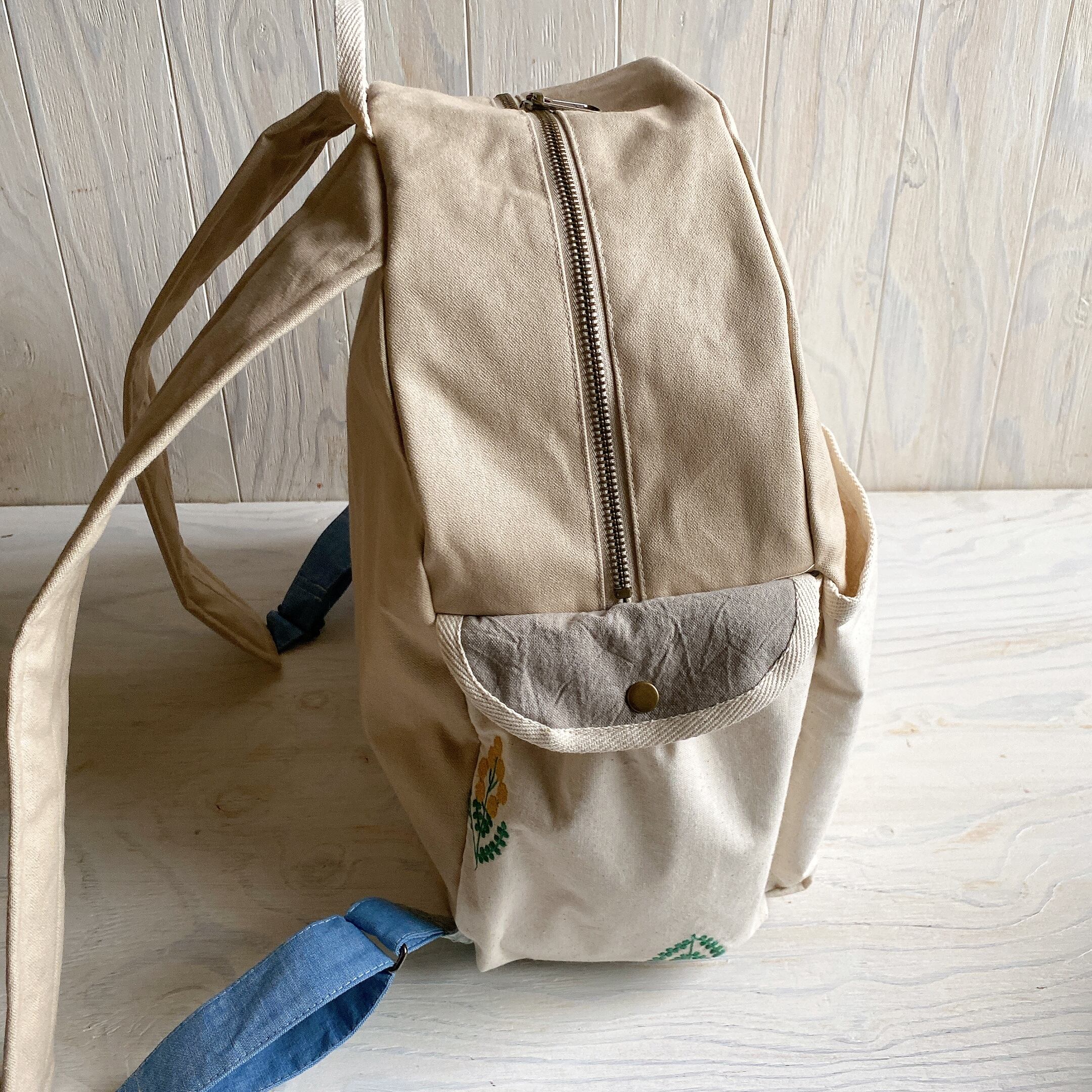 本体は弱撥水加工の8号のハンプと柄の生地は芯を張った綿麻の生地を使い、