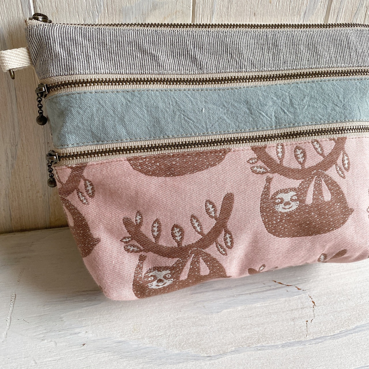 マチ付き3ファスナーポーチ・ポシェットにもなります(ナマケモノ・ピンク)