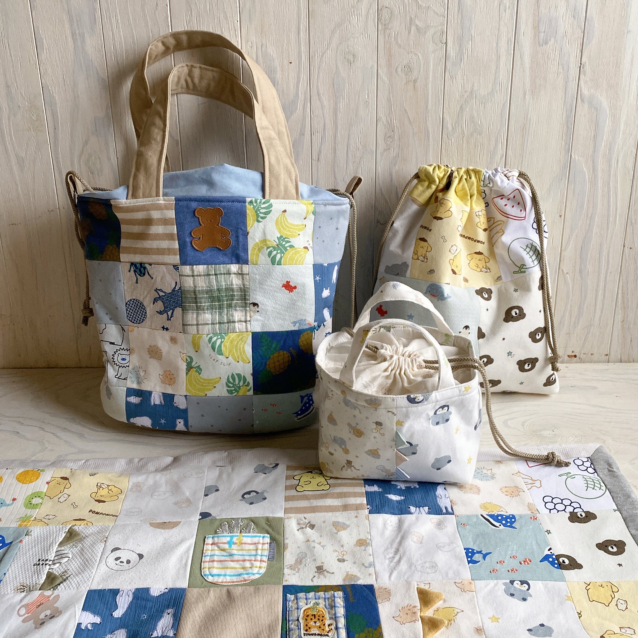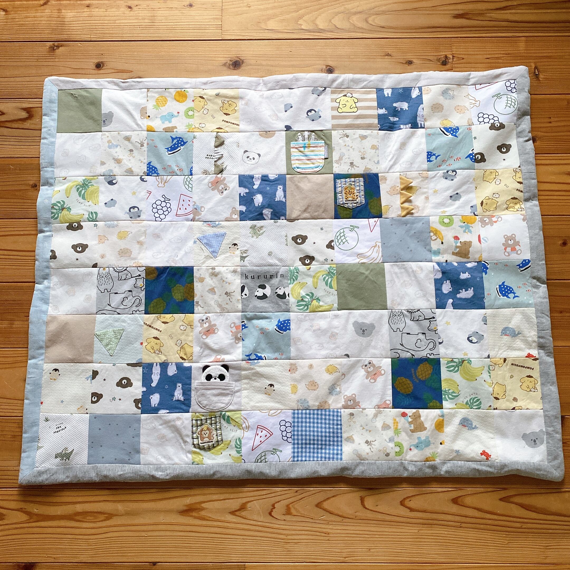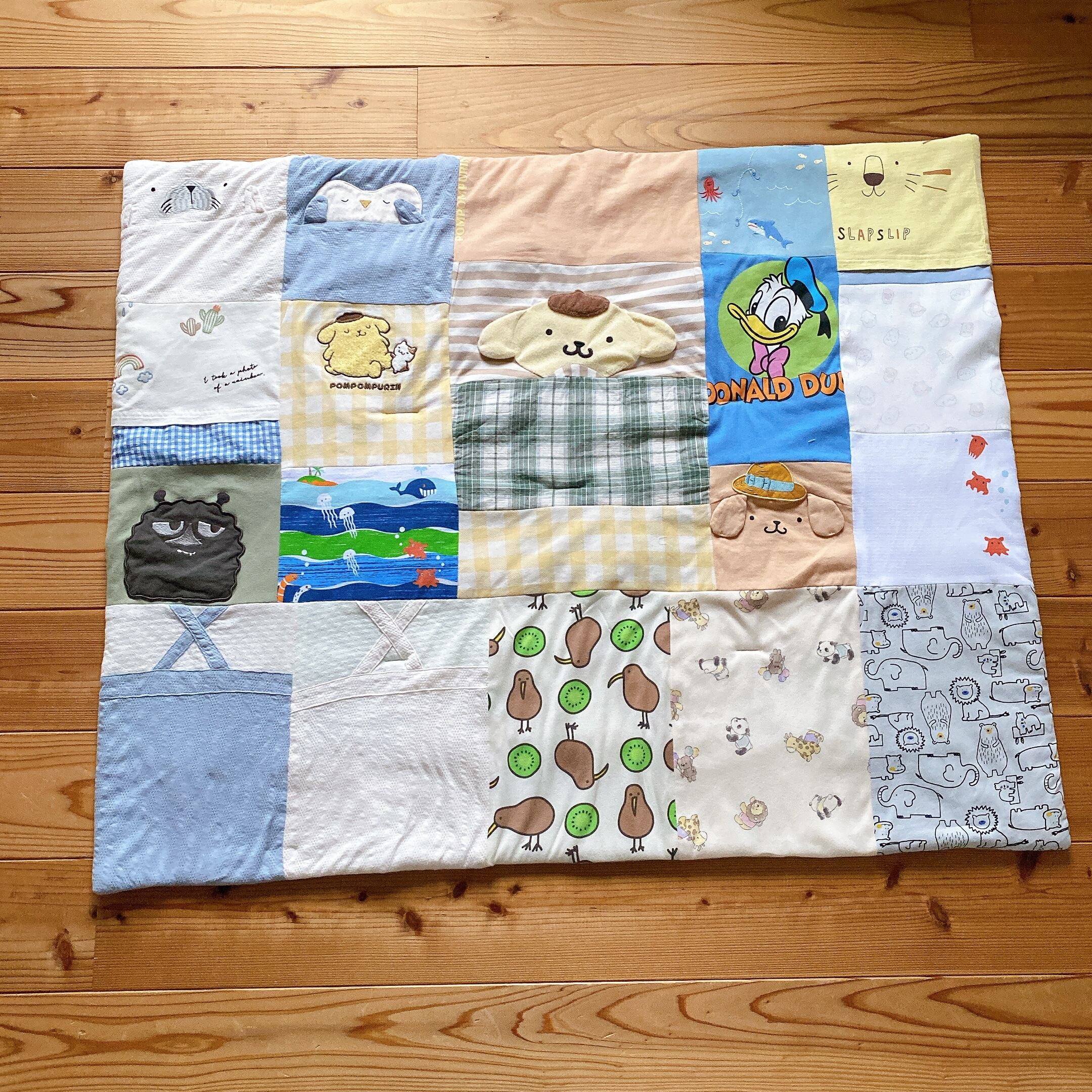 サイズアウトしたベビー服をブランケットにリメイクしました。
