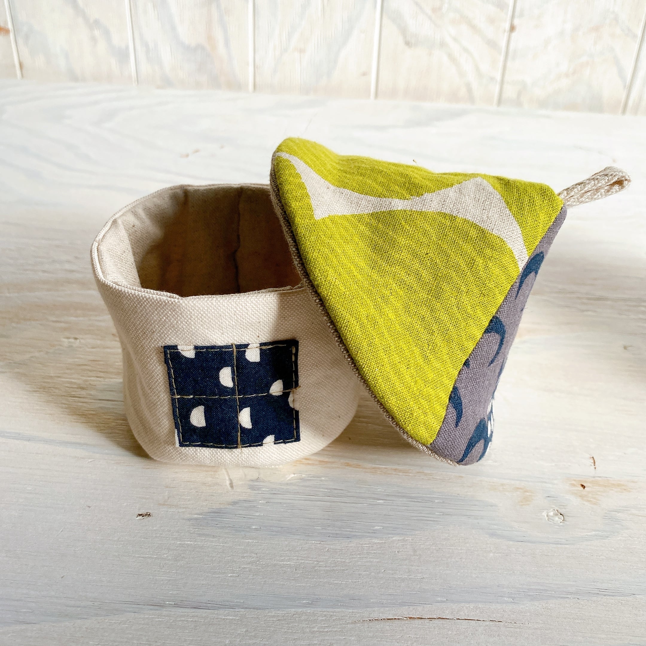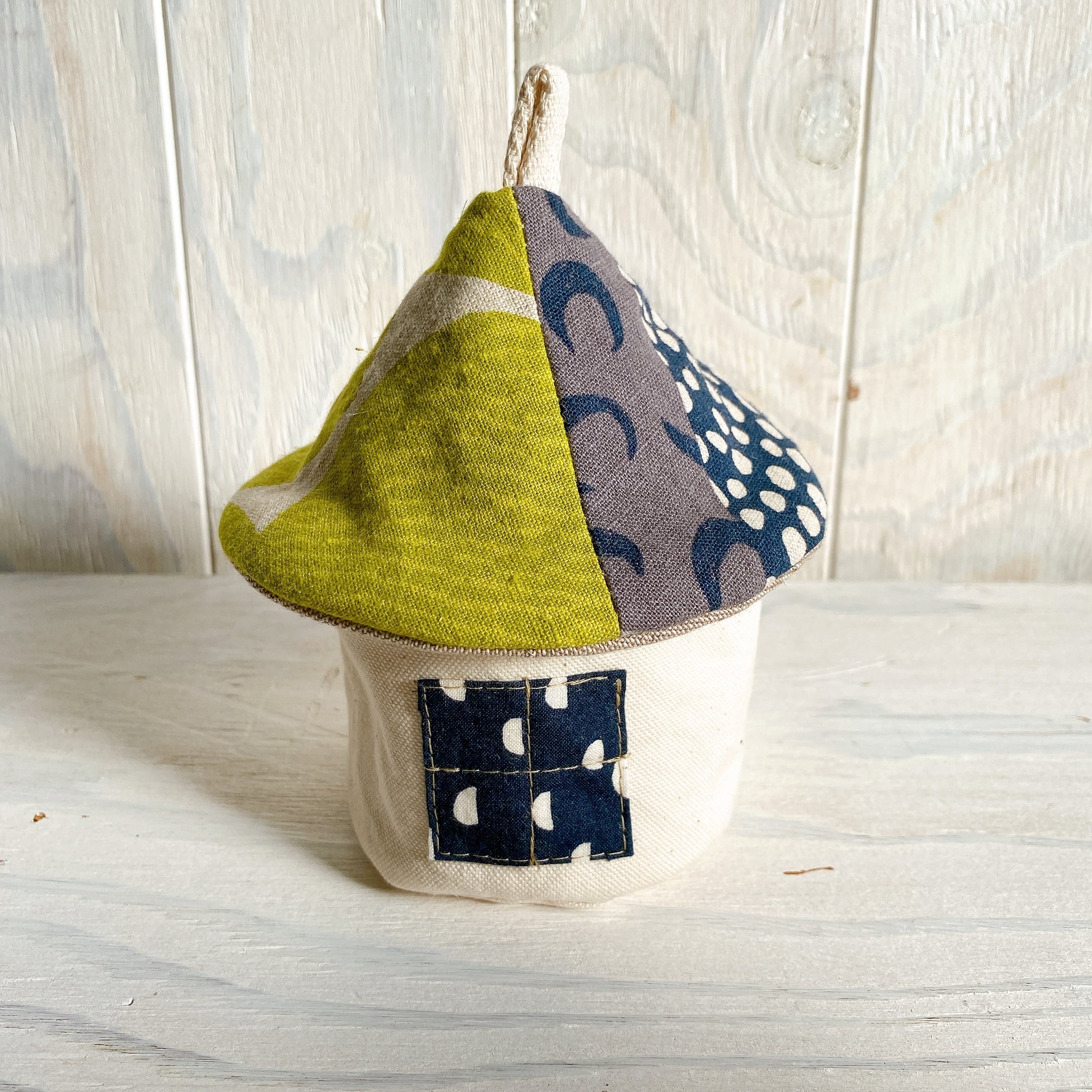 屋根が鍋つかみになった、ちいさなおうちの形の小物入れ