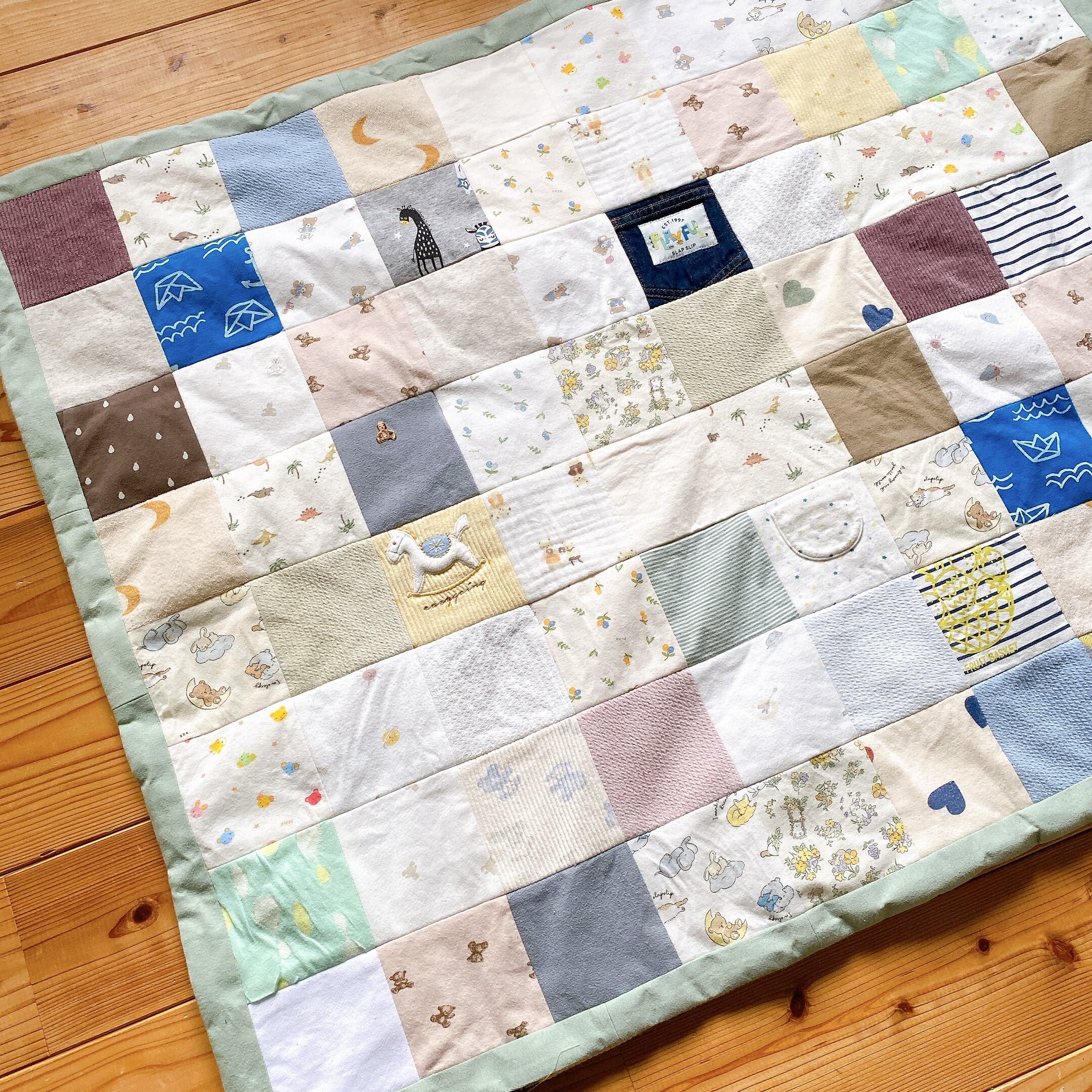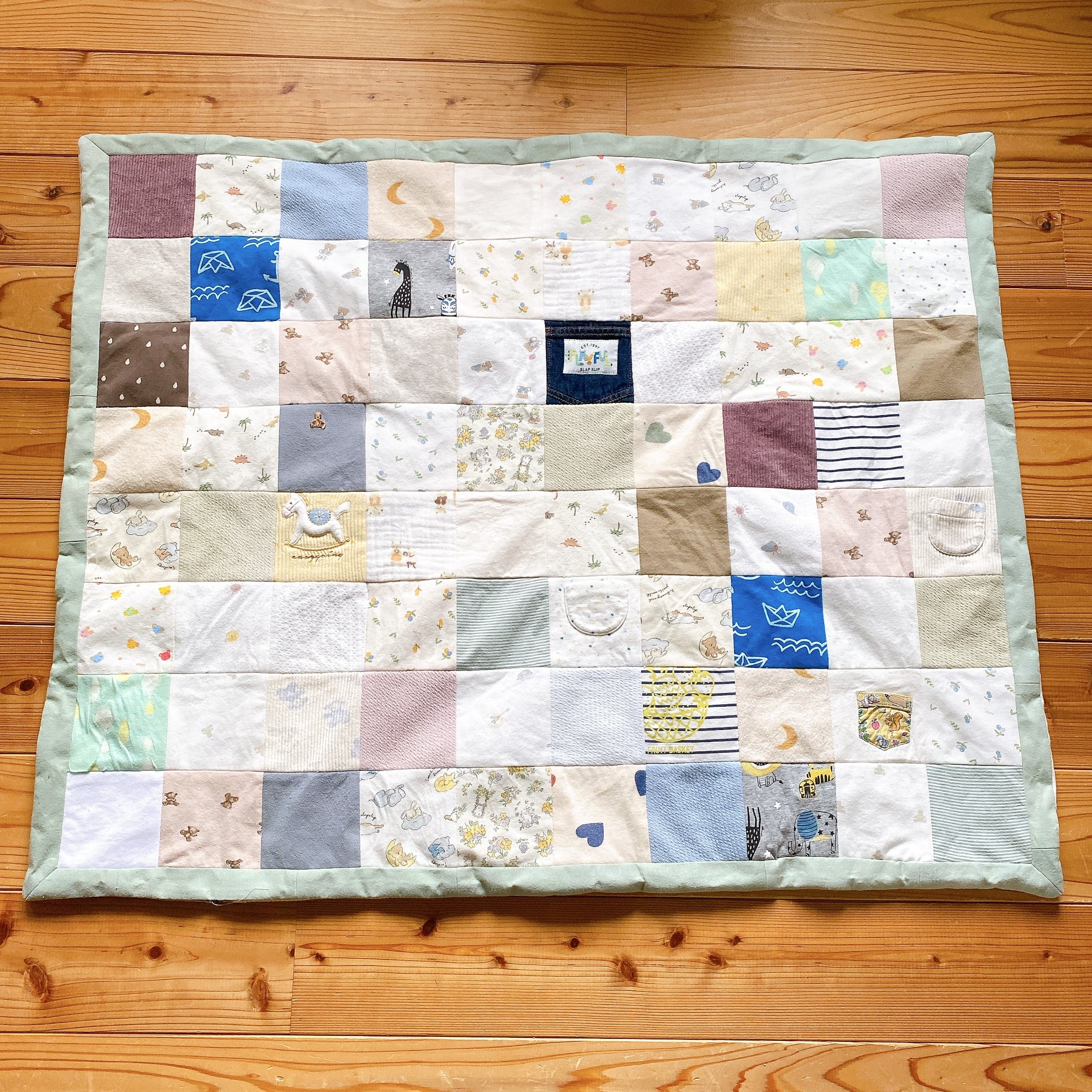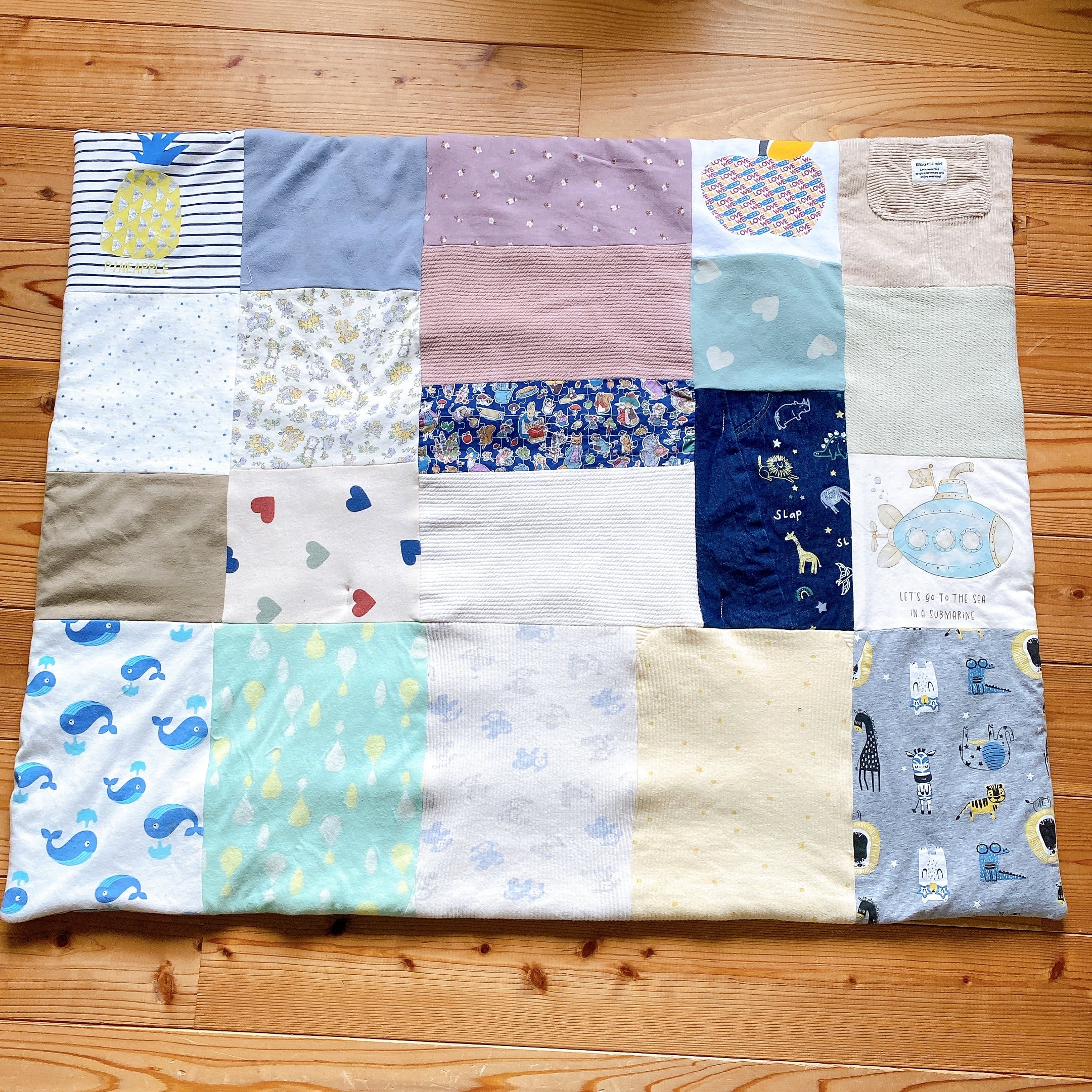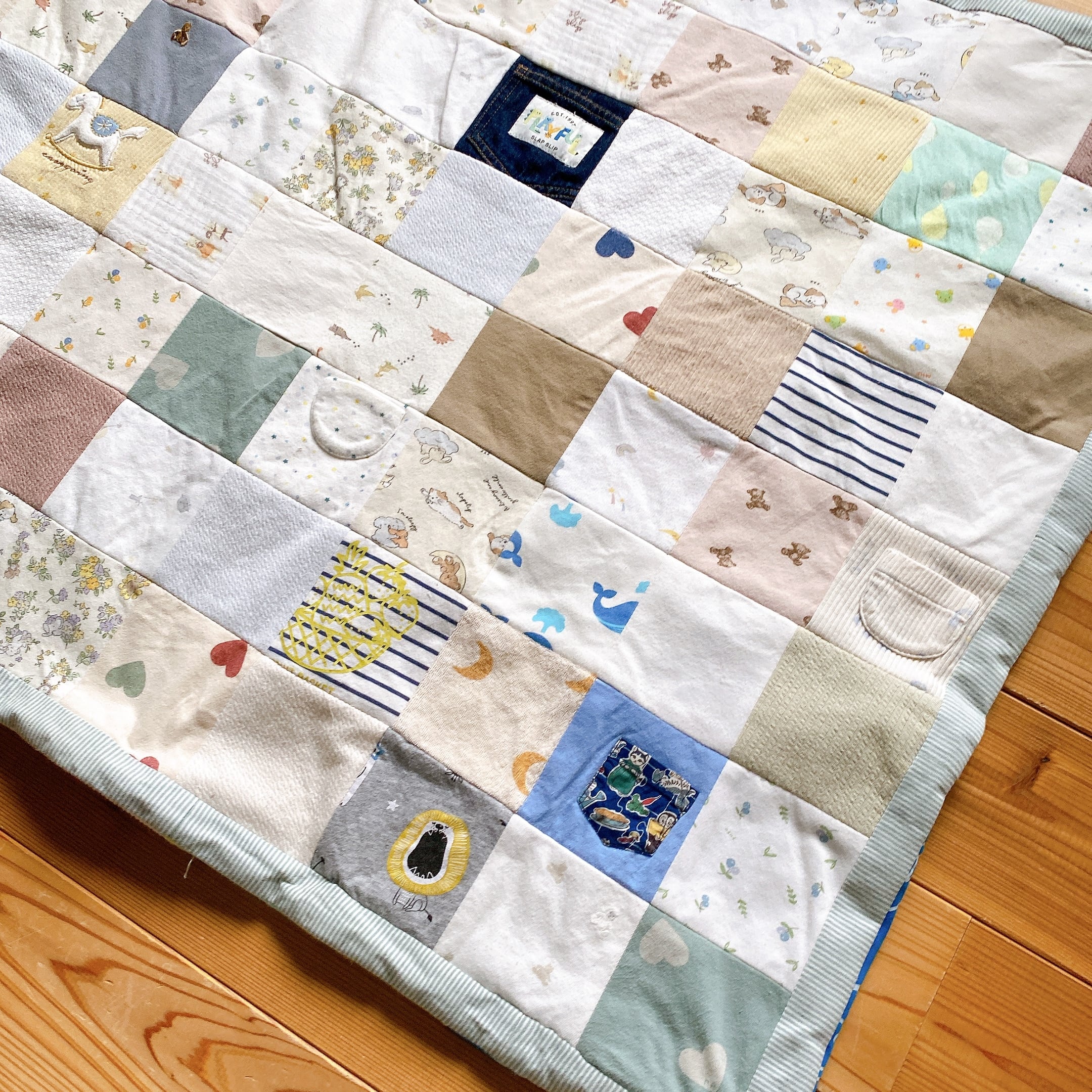 サイズアウトしたベビー服をブランケットにリメイクしました。