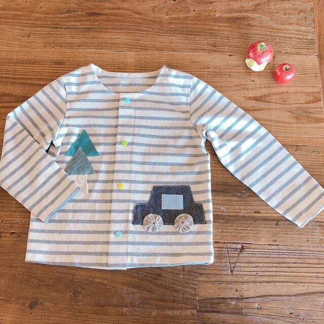 森にドライブ★スナップカーディガン(グレーボーダー)★サイズ110