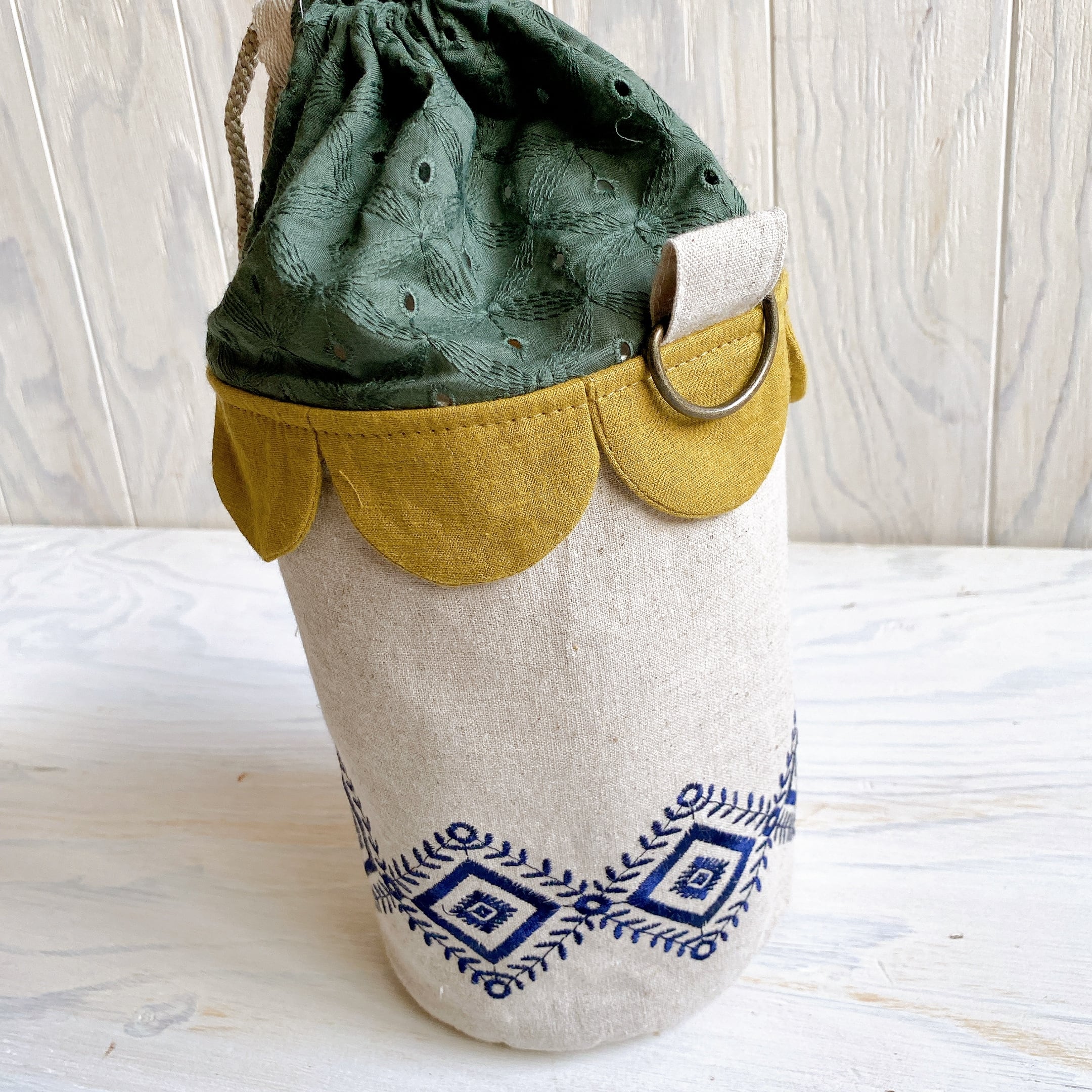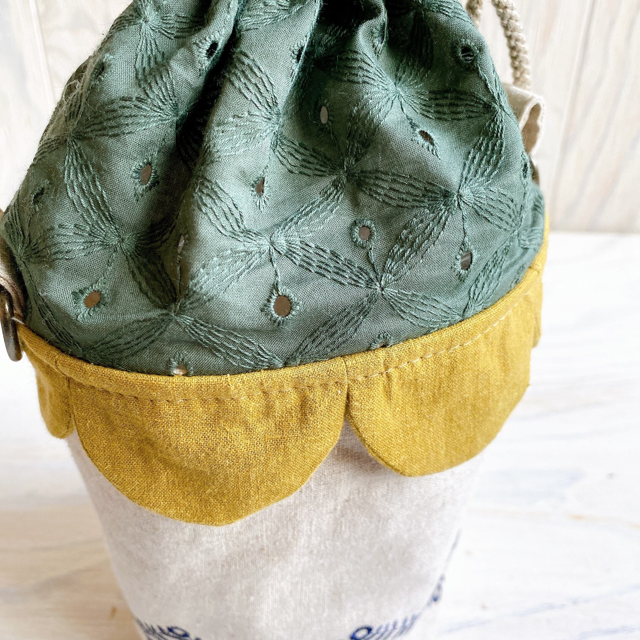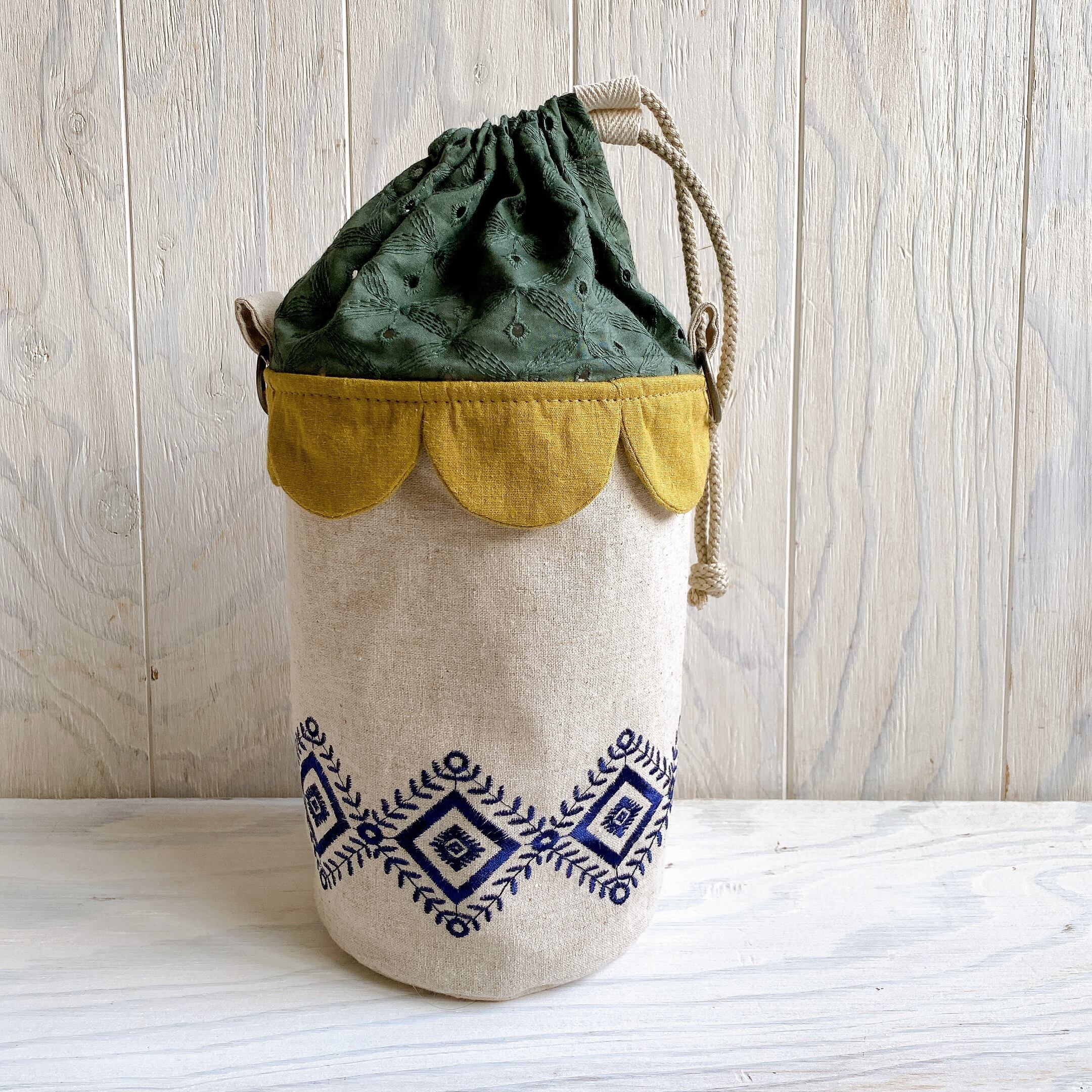 円柱おうち巾着*ひしがた刺繍×カーキ
