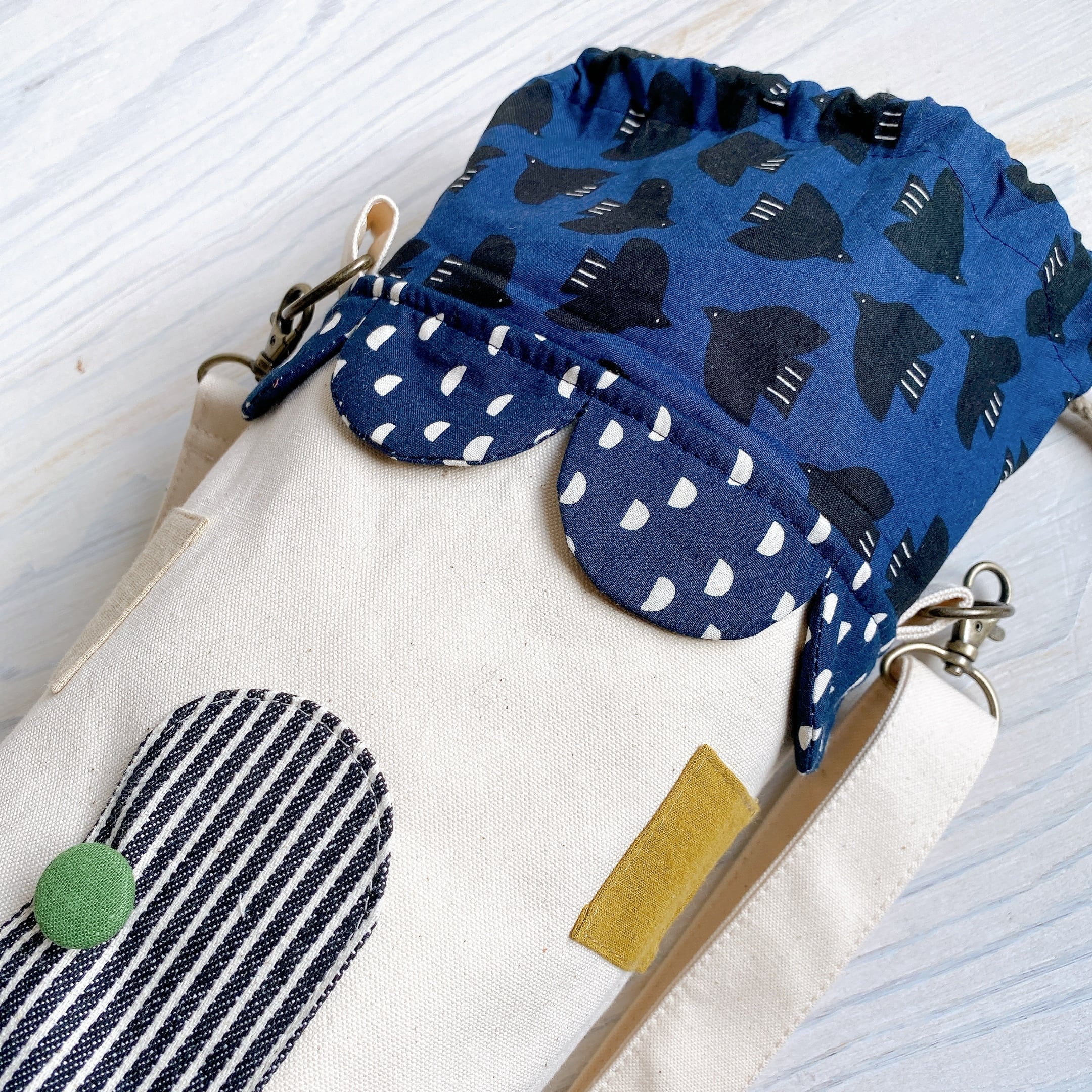 いろいろな布を組み合わせて、ひとつずつ仕立てました。