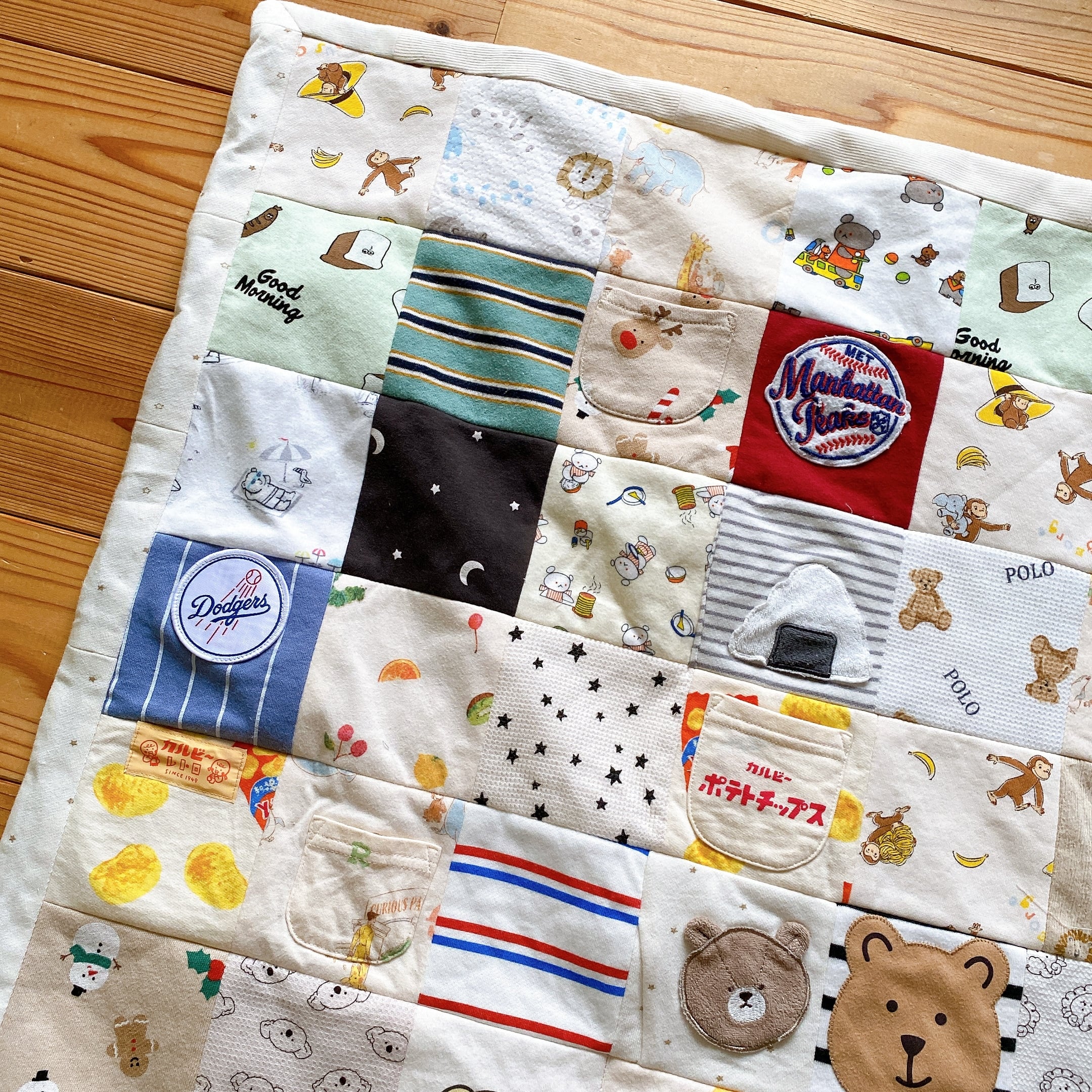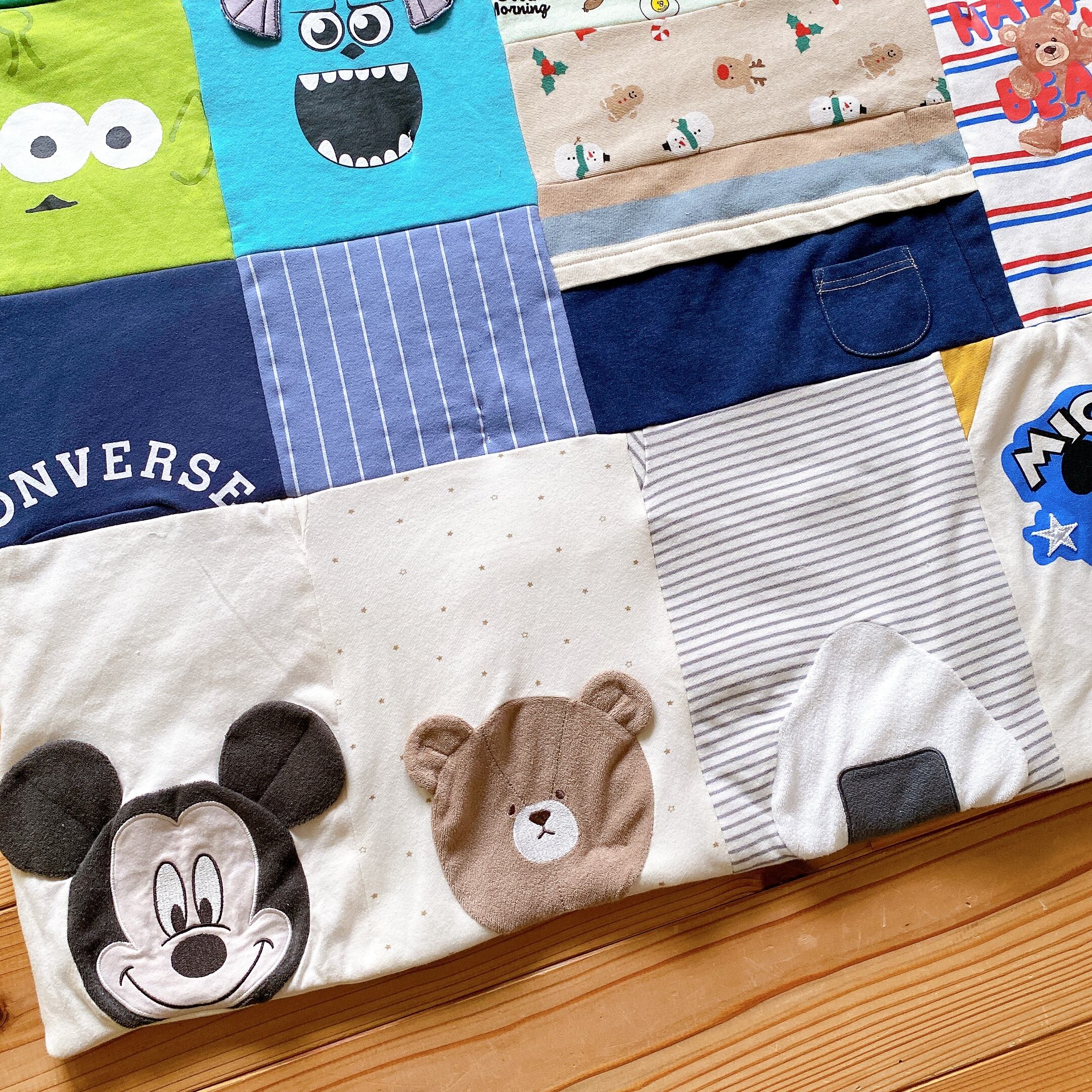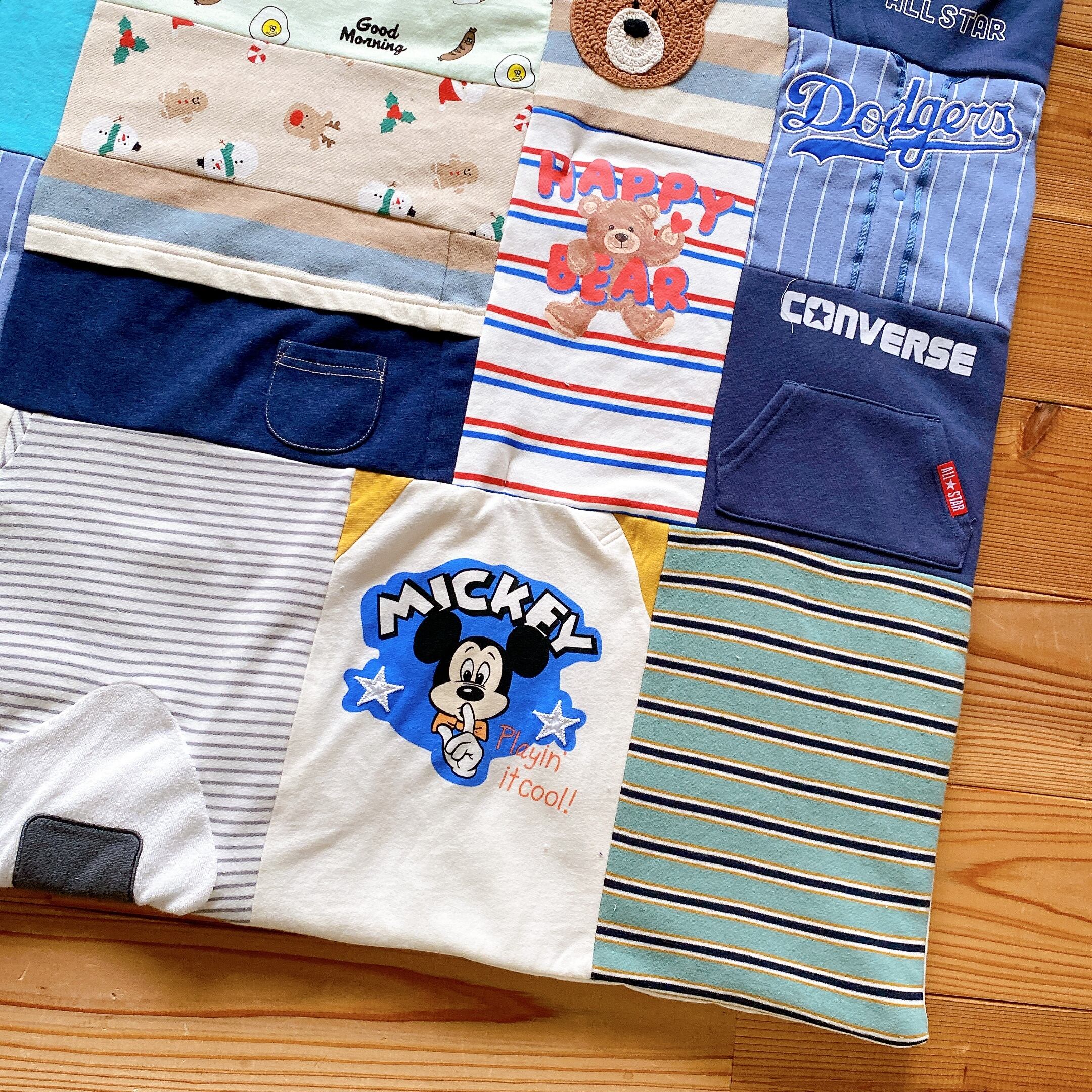 サイズアウトした子供服をブランケットにリメイクしました。