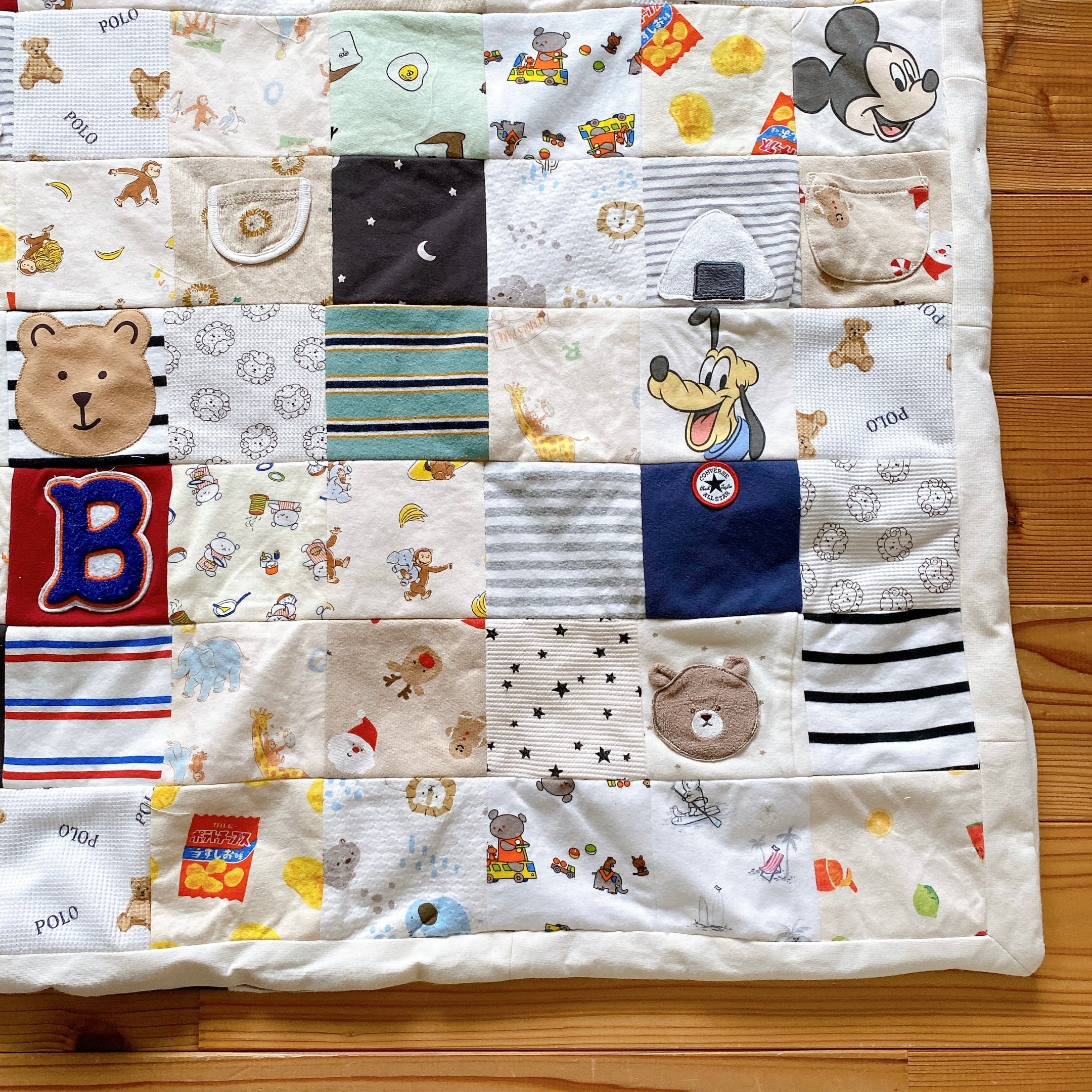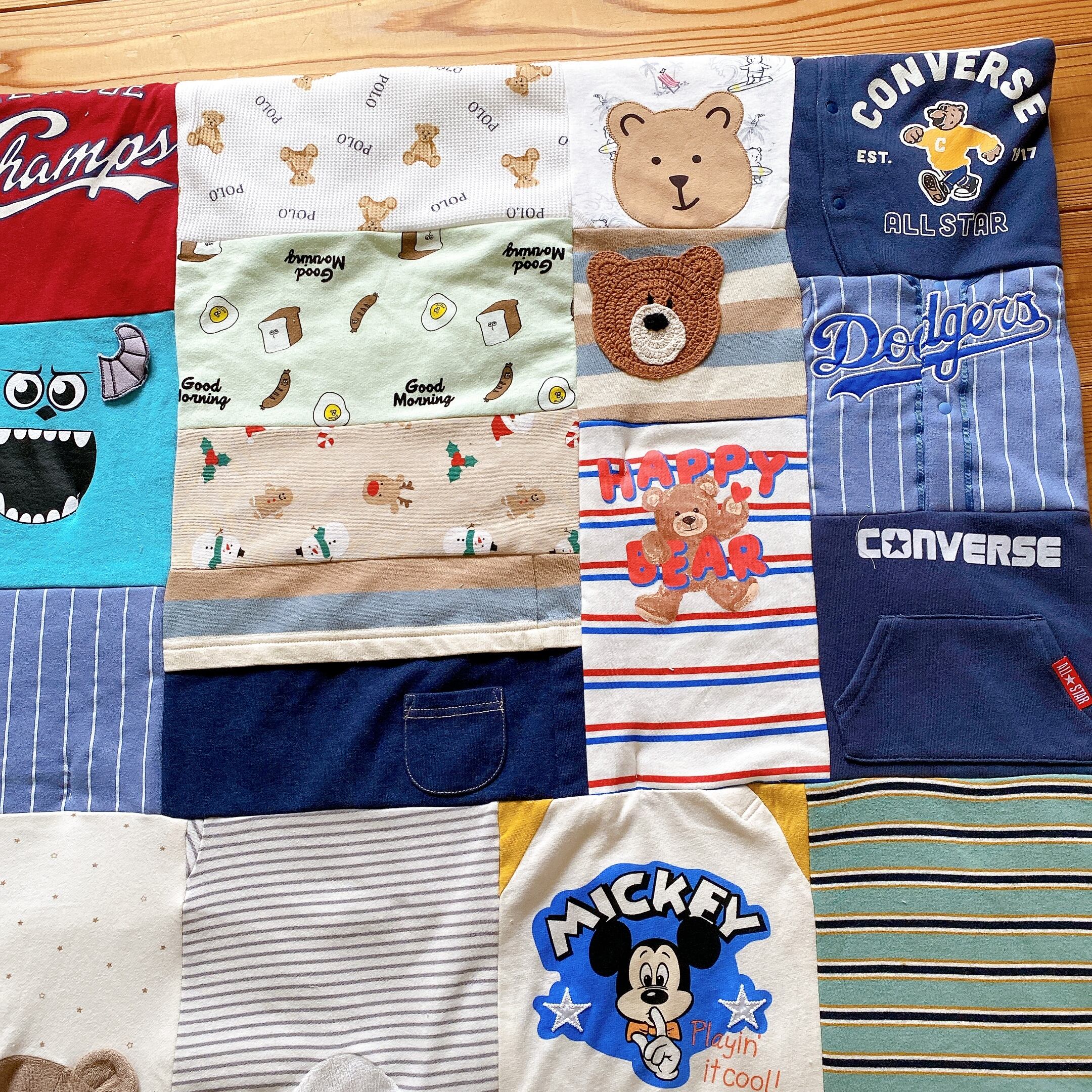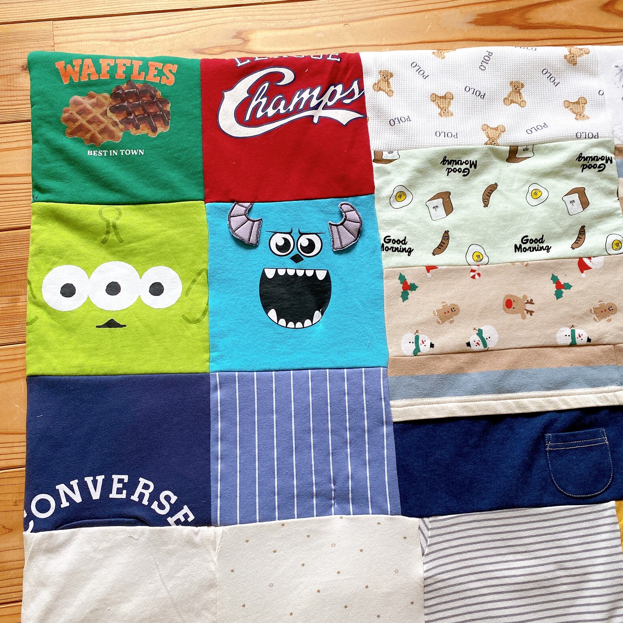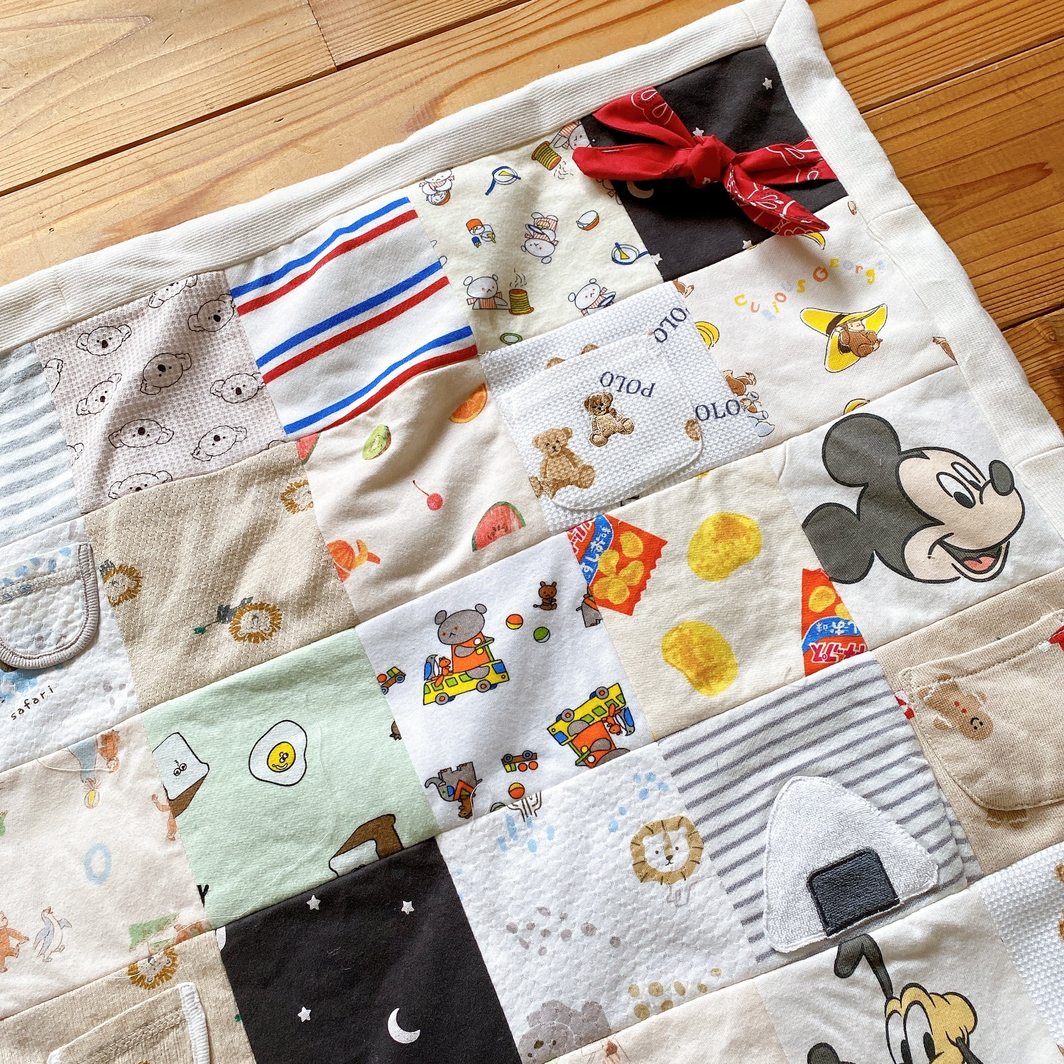サイズアウトした子供服をブランケットにリメイクしました。