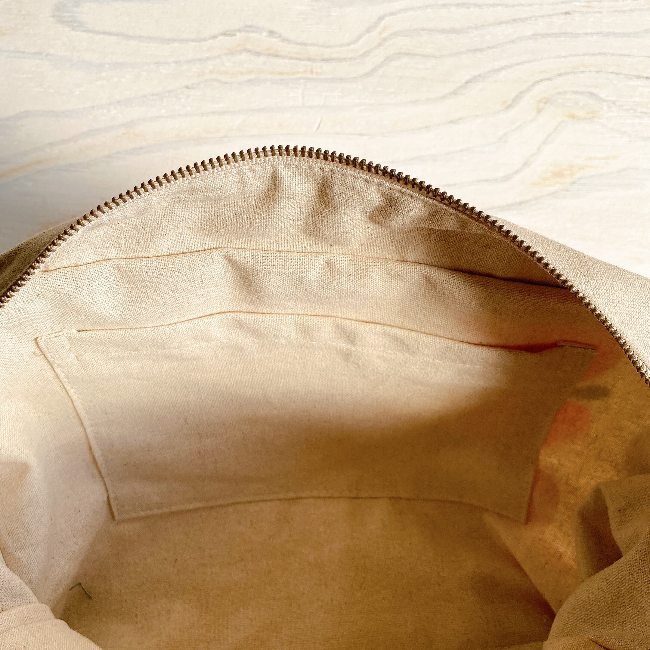 裏地は綿麻キャンバス、マチの部分はハンプの生地を使っていますのでハリがあります