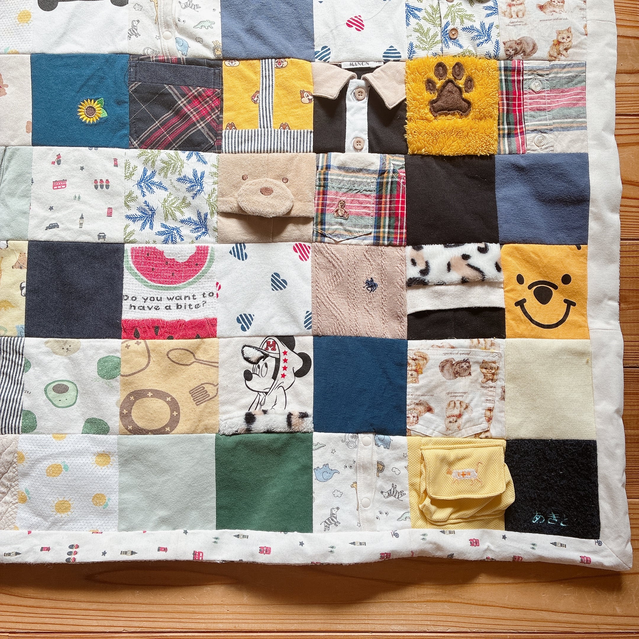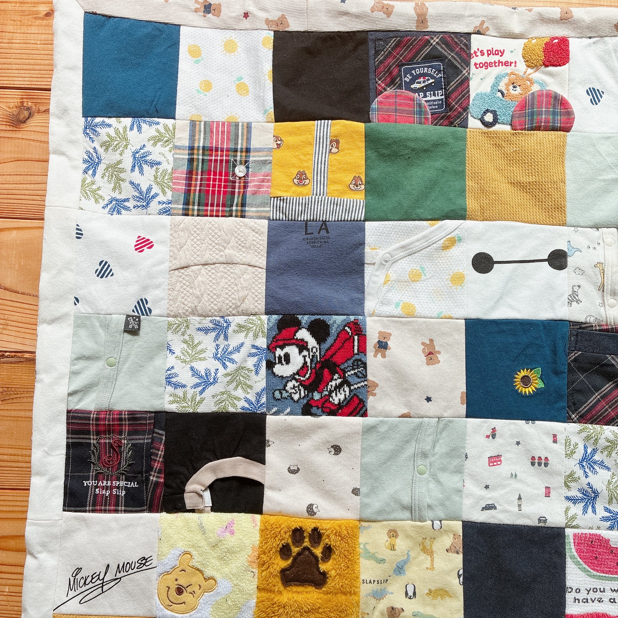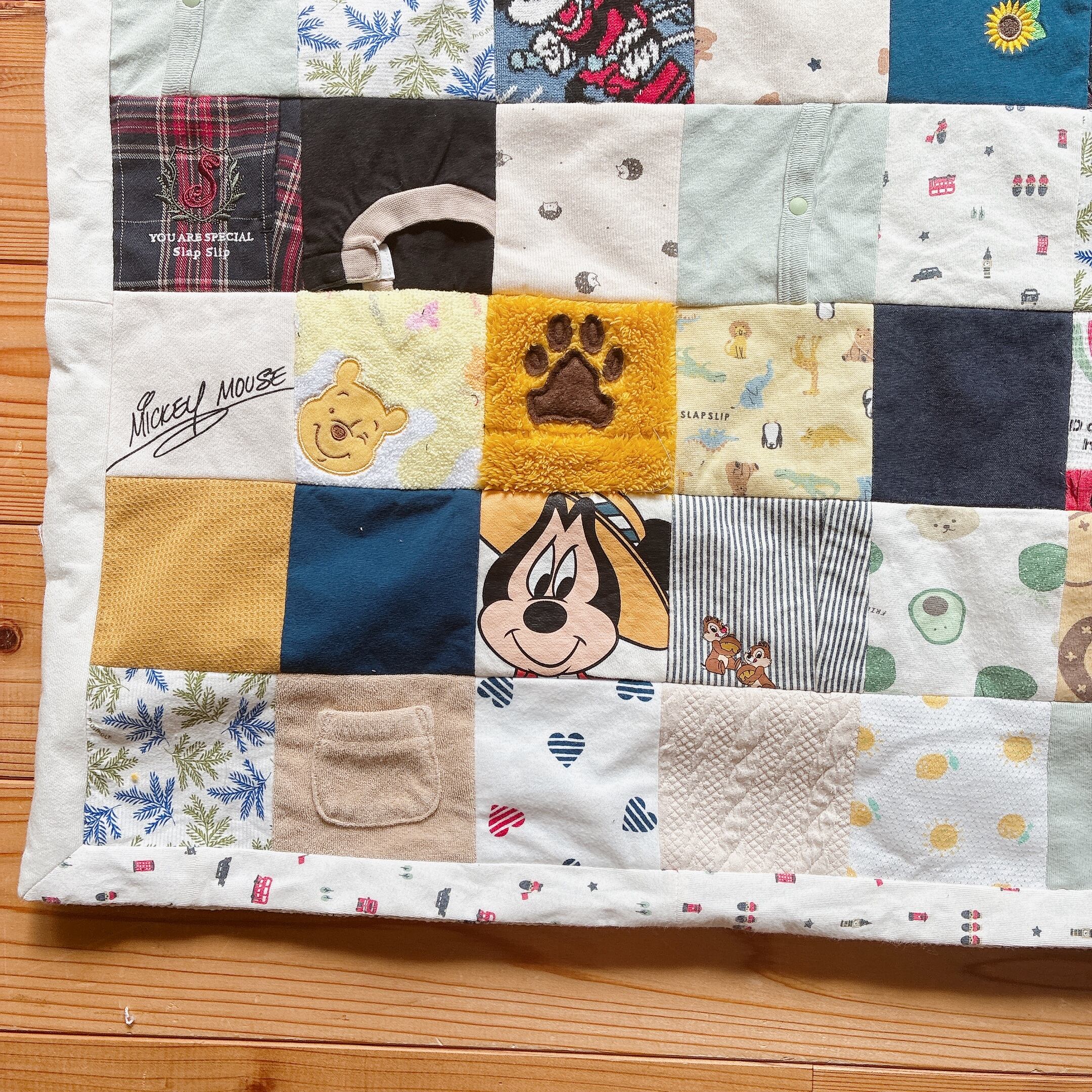 サイズアウトしたベビー服をブランケットにリメイクしました。
