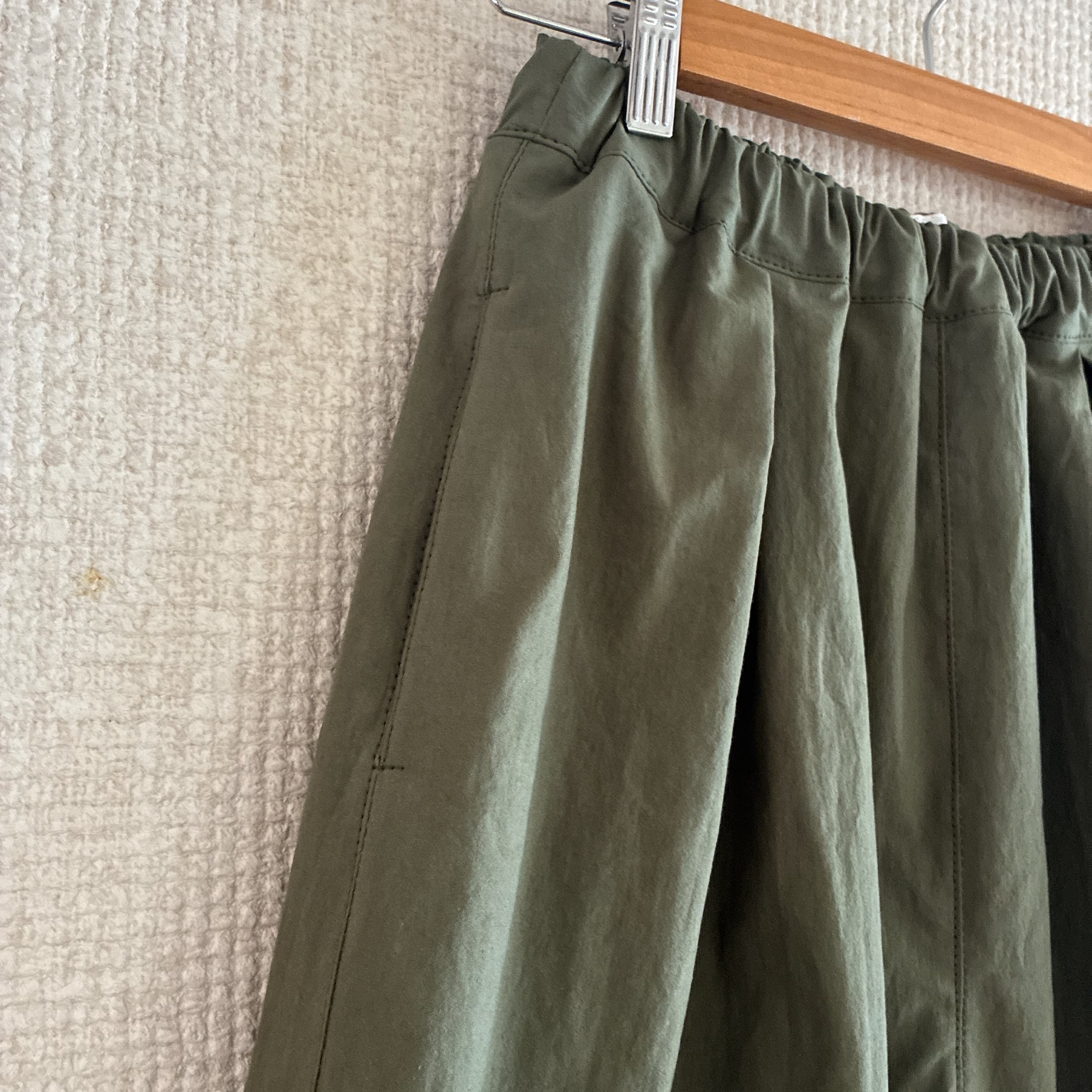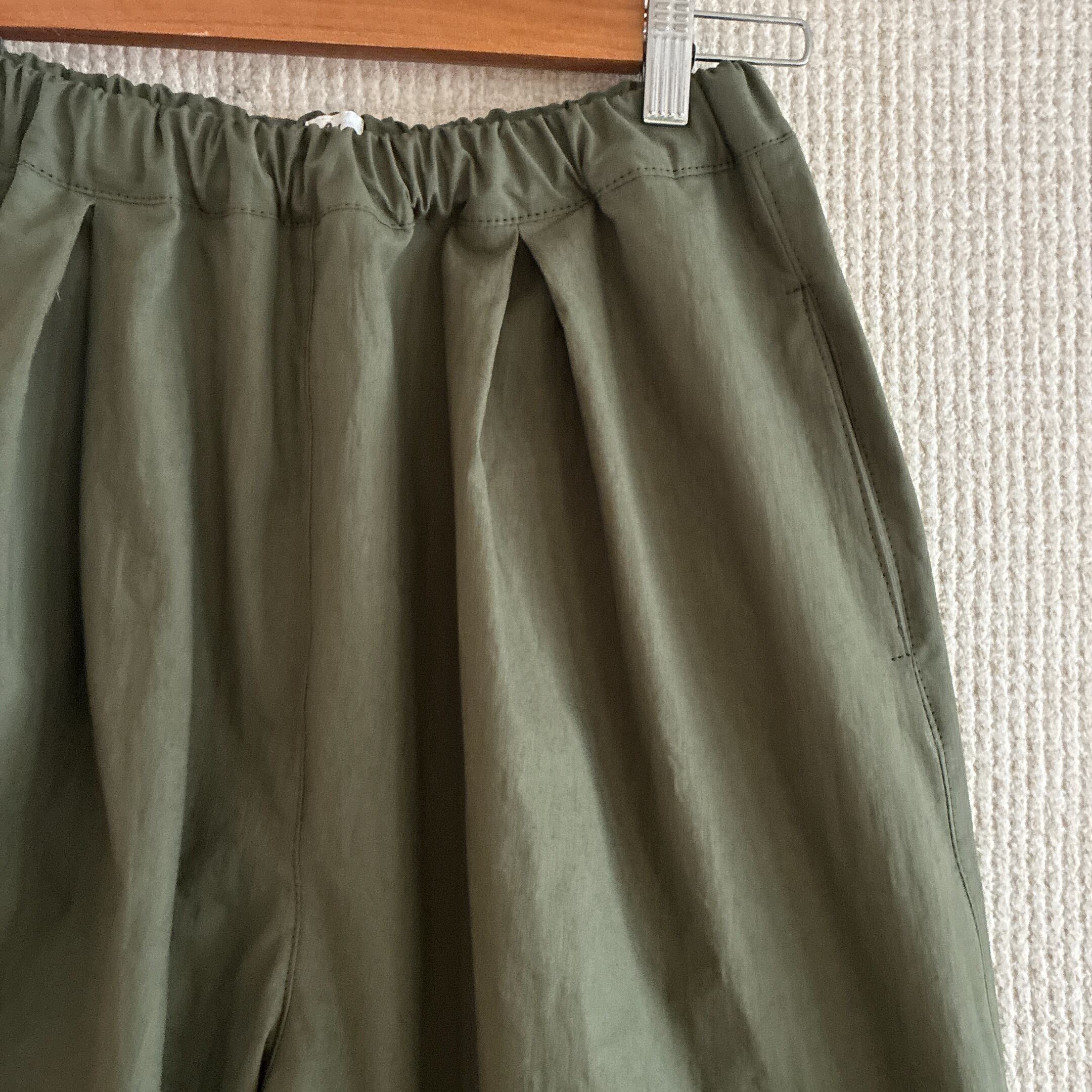 ハリのある生地を活かして、ウエストとすそにタックを入れ、自然と立体感のあるシルエットに。