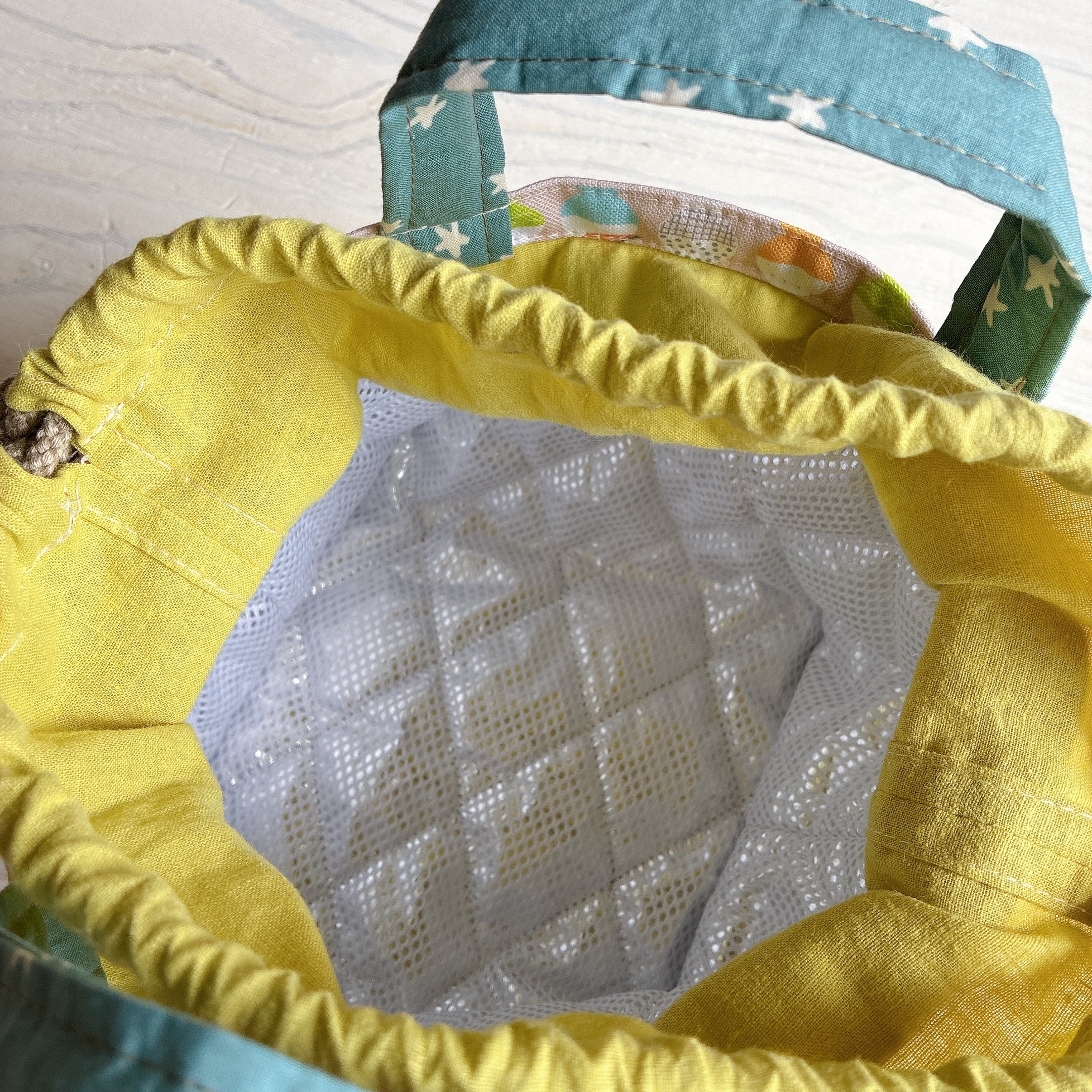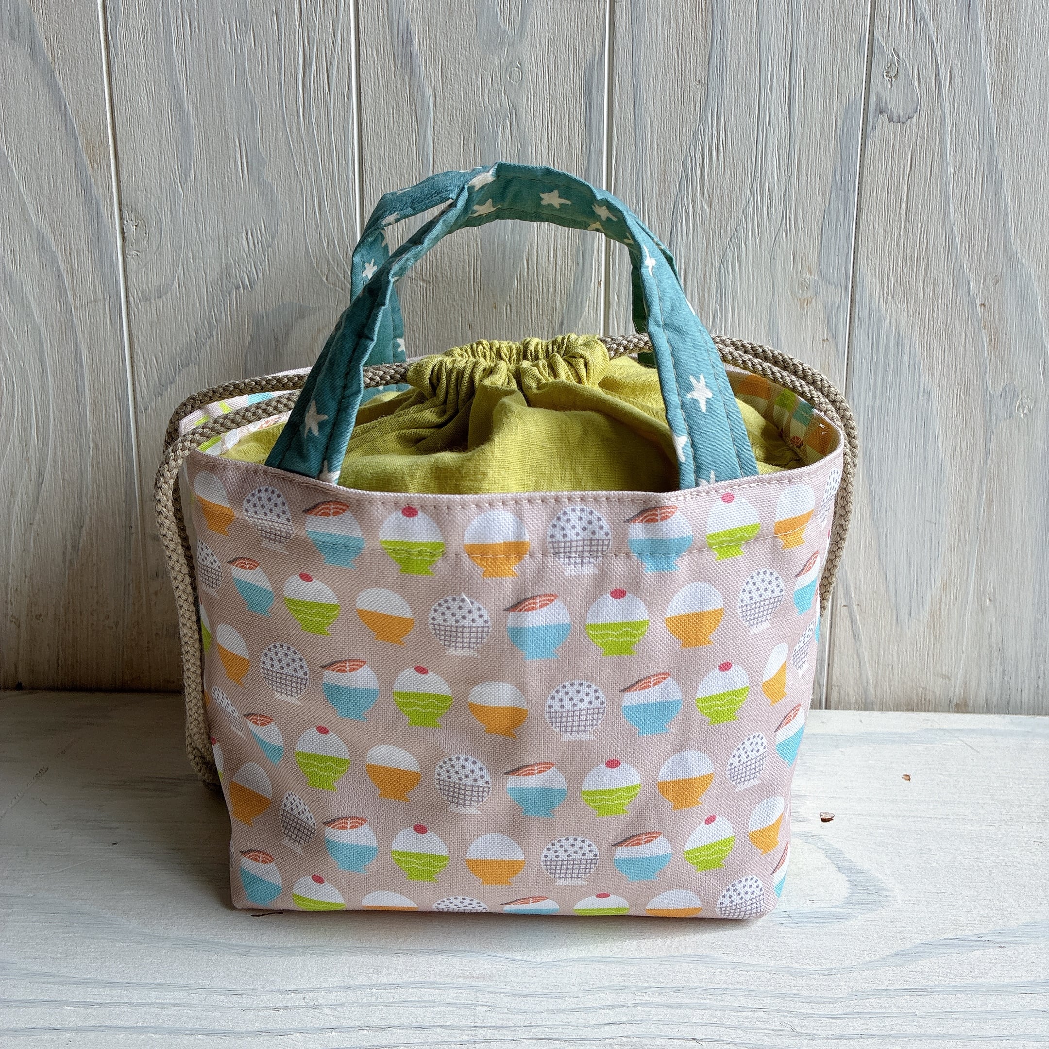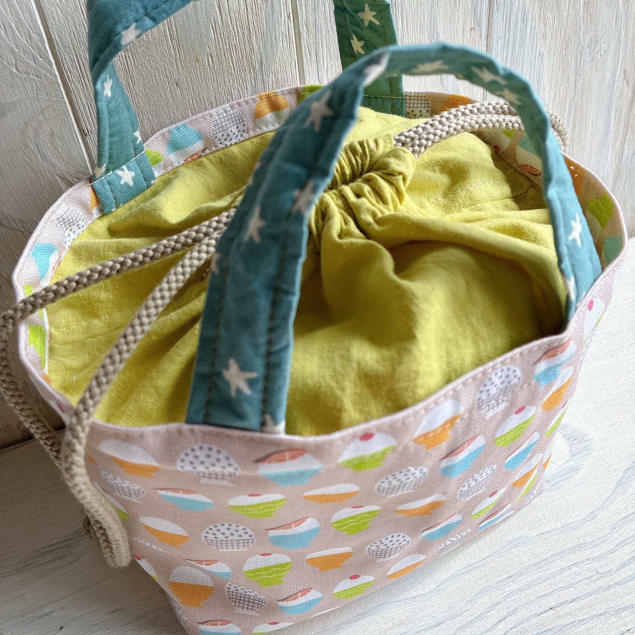 3種類の生地を組み合わせて、巾着付きのバックを作りました。