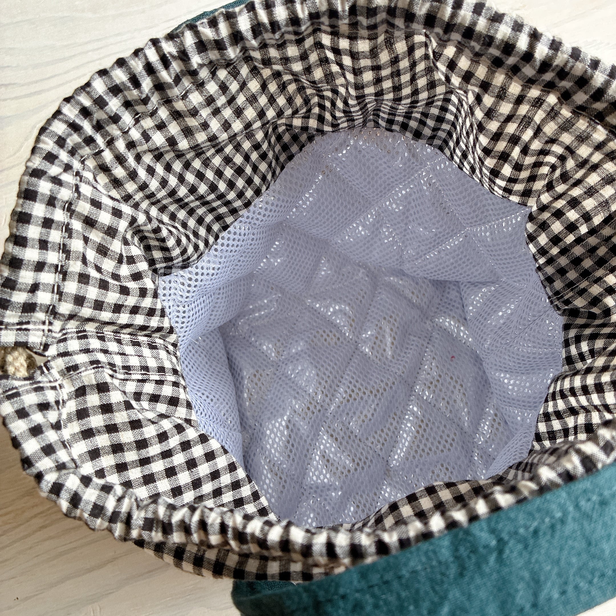 裏地には保冷保温効果のあるアルミシートを使用したキルティングの生地を使用しています。