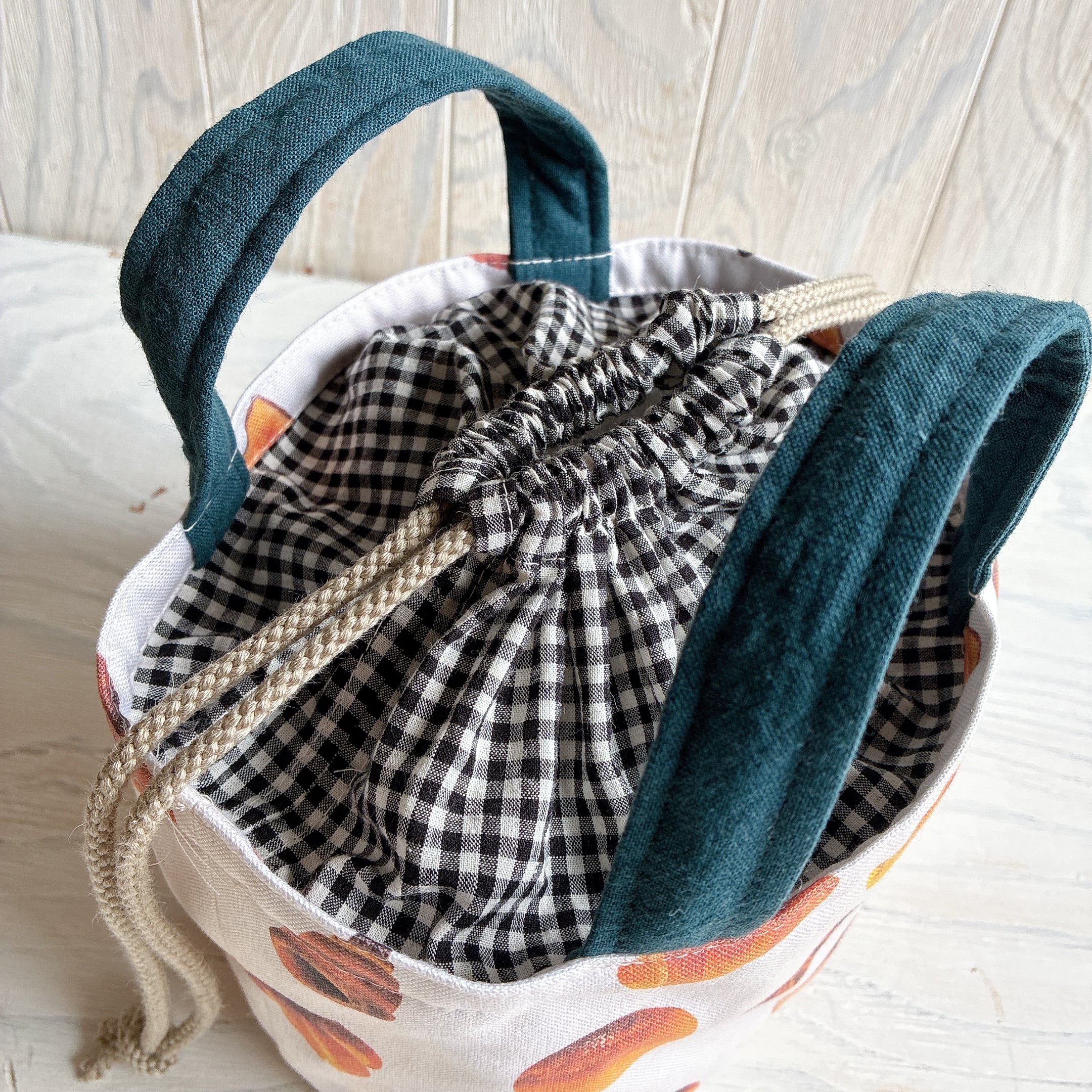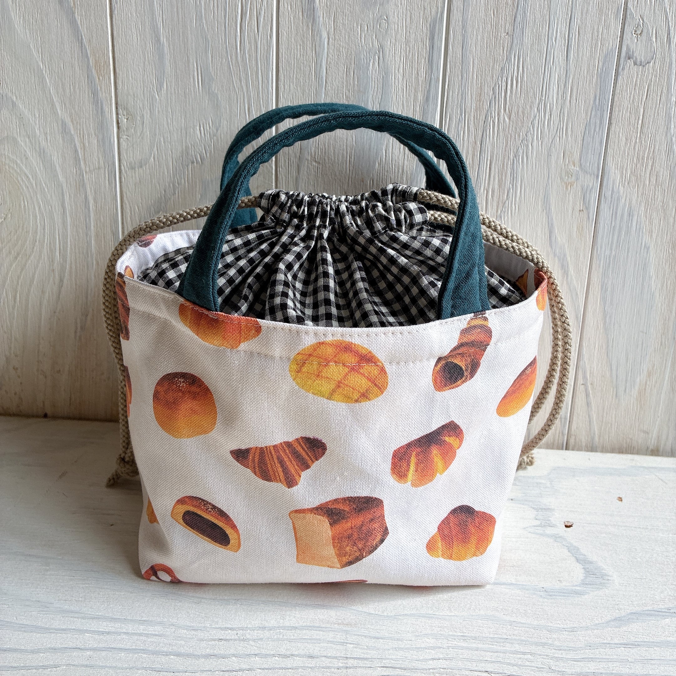 3種類の生地を組み合わせて、巾着付きのバックを作りました。