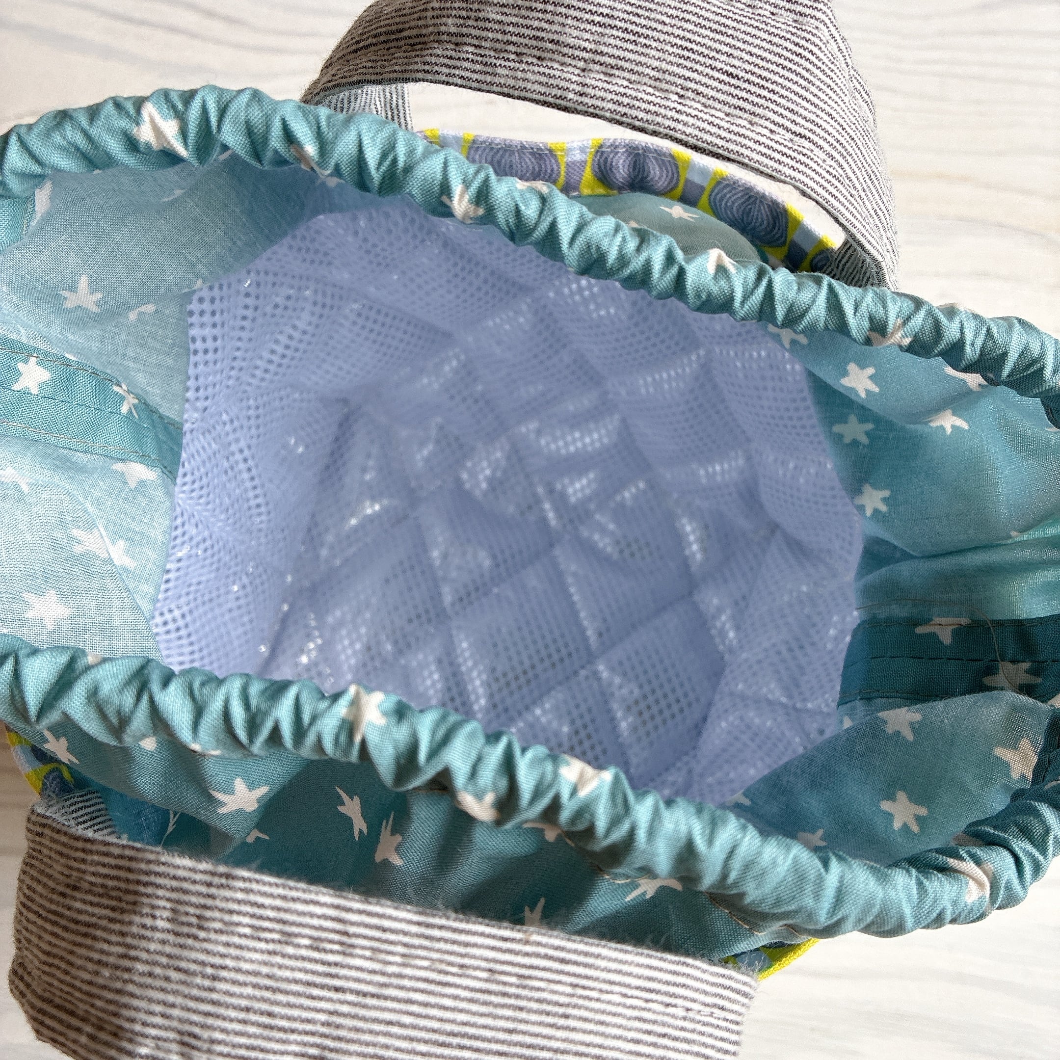 3種類の生地を組み合わせて、巾着付きのバックを作りました。