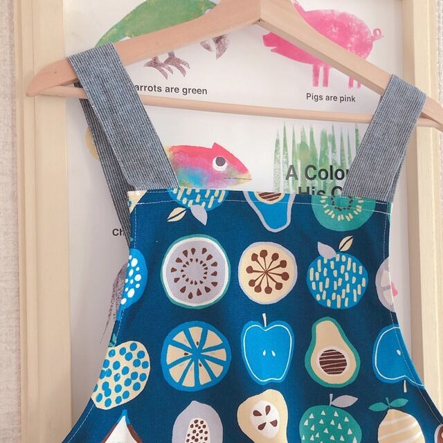 【オーダーのお品】肩ひも後ろはHの形。おとなエプロン(フルーツ・ネイビー)