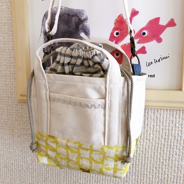 斜め掛けもできる*2way*巾着付き★ミニトートバック(キイロバード)