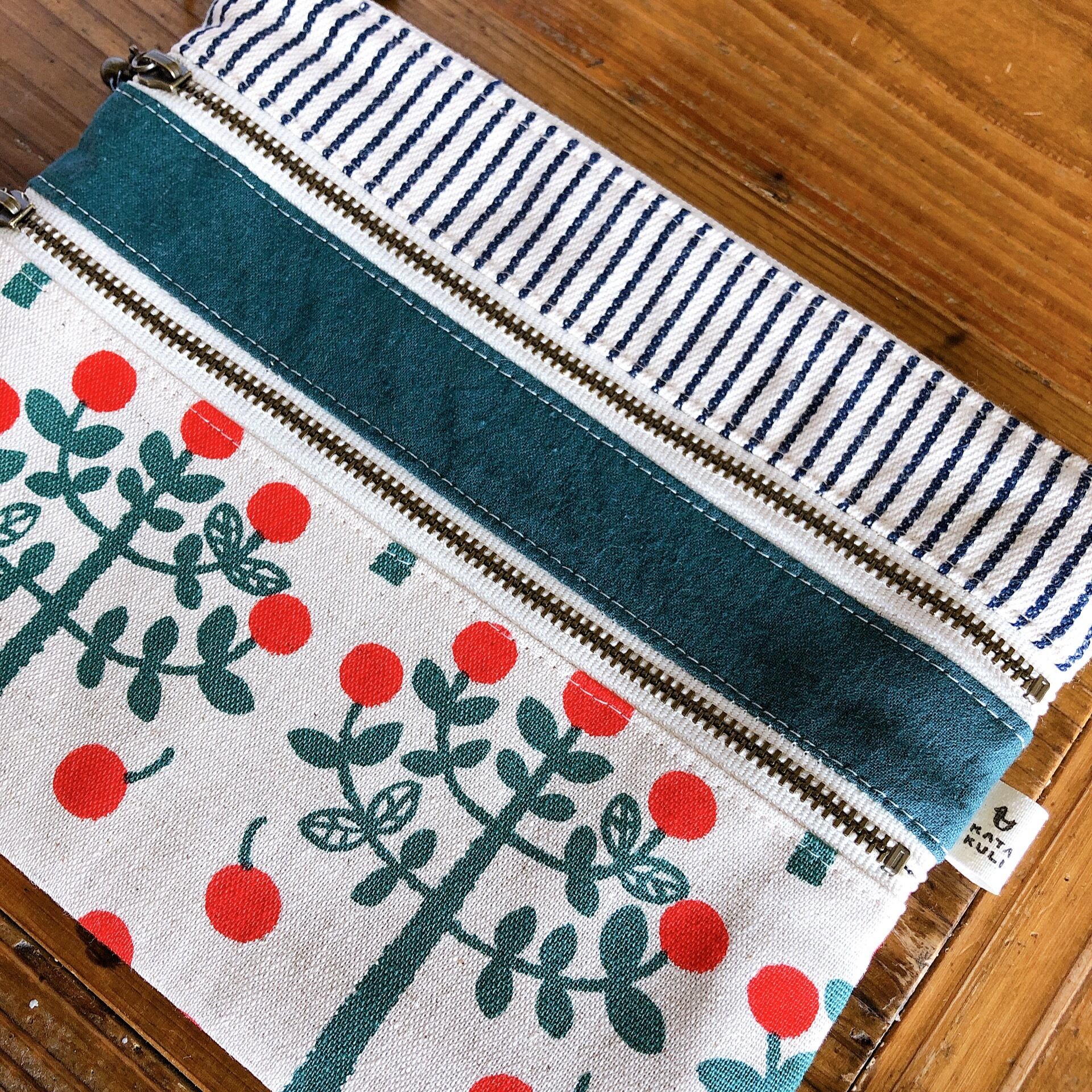 ファスナー開きのお部屋が3つあるフラットポーチです。