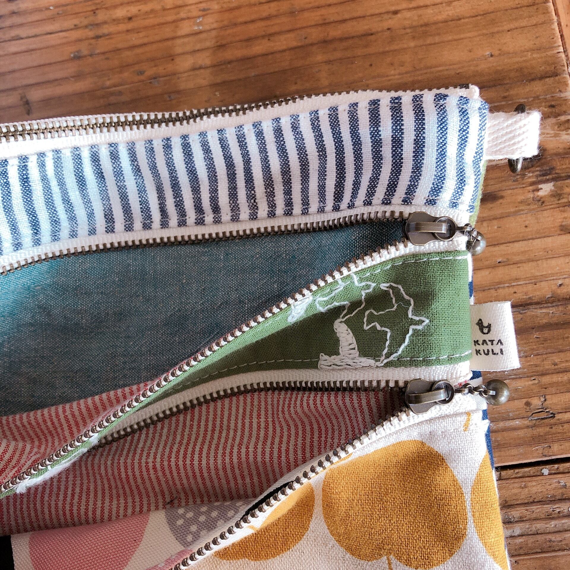 ファスナー開きのお部屋が3つあるフラットポーチです。