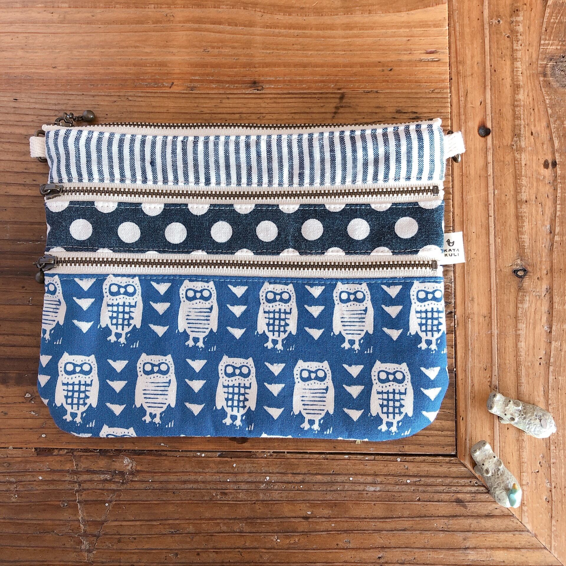 ポシェットにもなります*3ファスナーポーチ(ふくろう・あお)