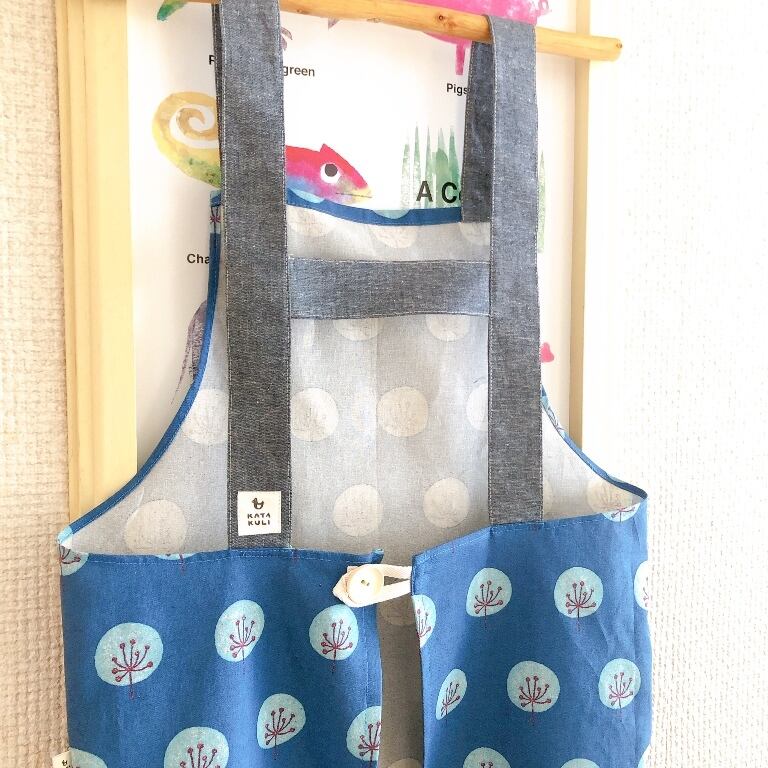 肩ひも後ろはHの形。おとなエプロン(ツリー・ブルー)