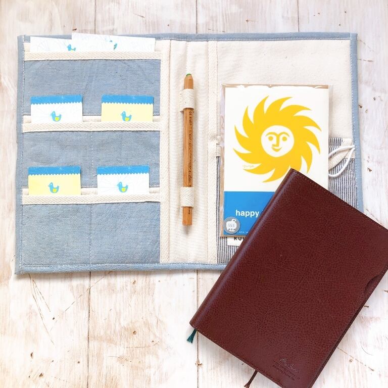 両サイドにもポケットがついていてA5サイズのノートが収まります。。