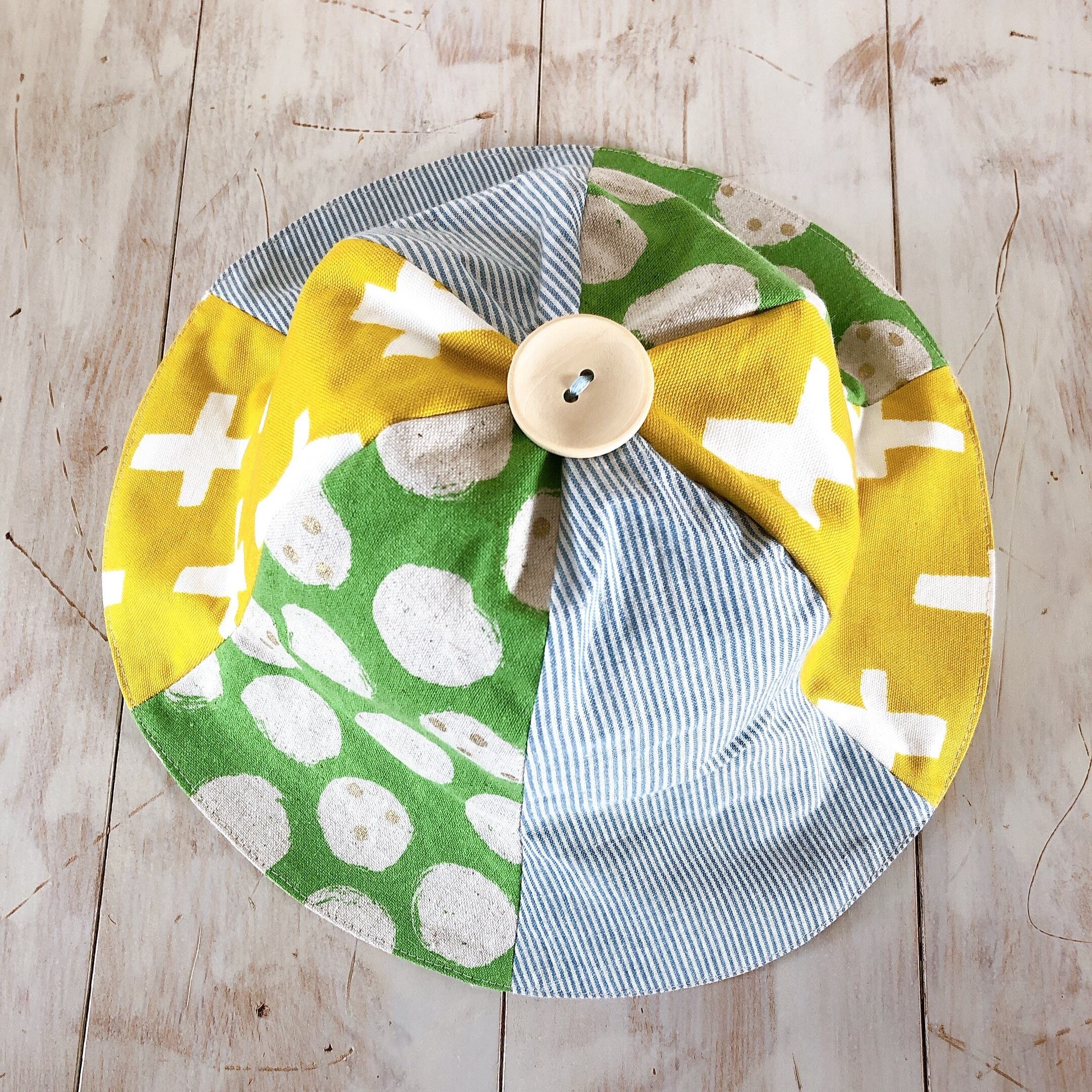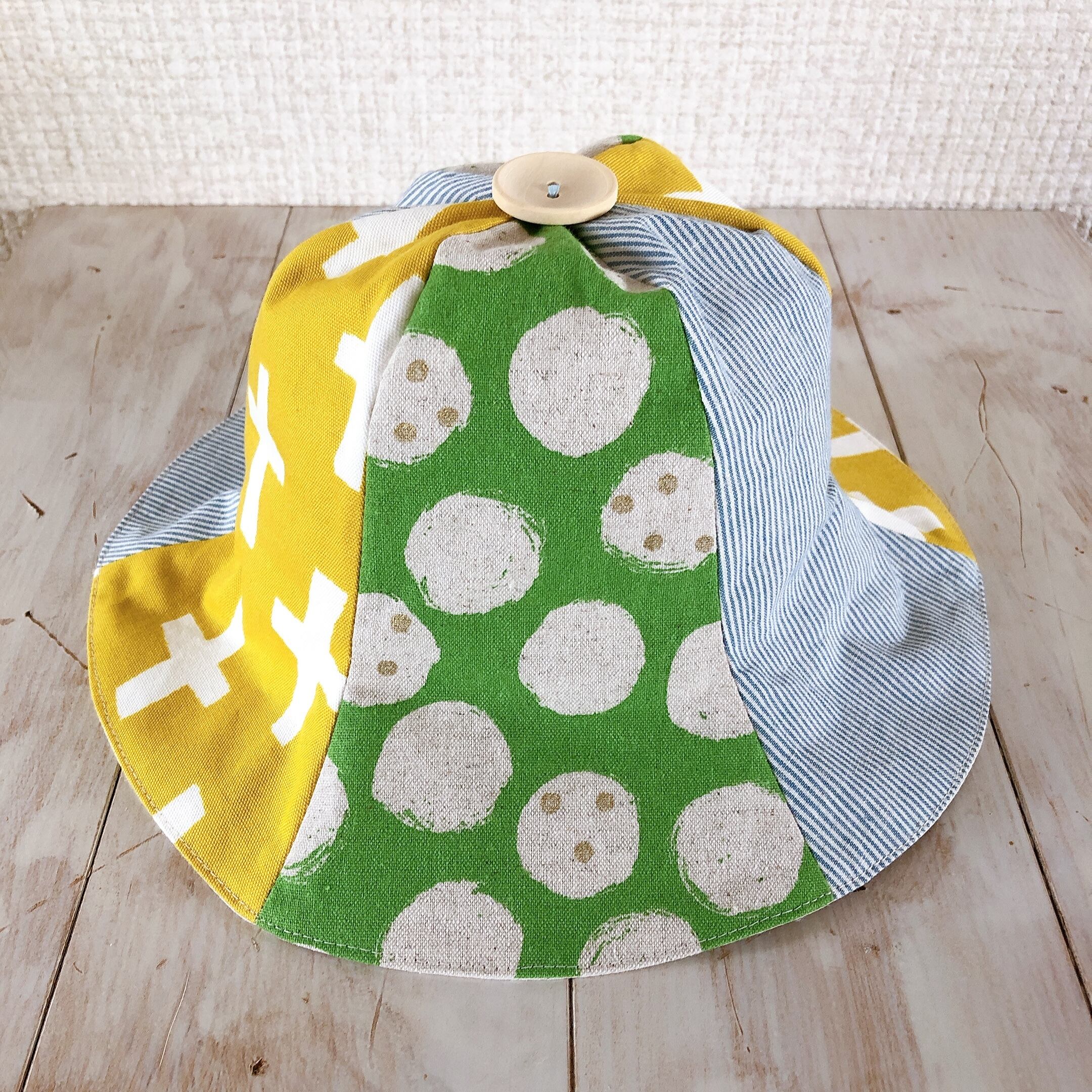 相性の良い3色の生地を組み合わせてチューリップハットにしました。