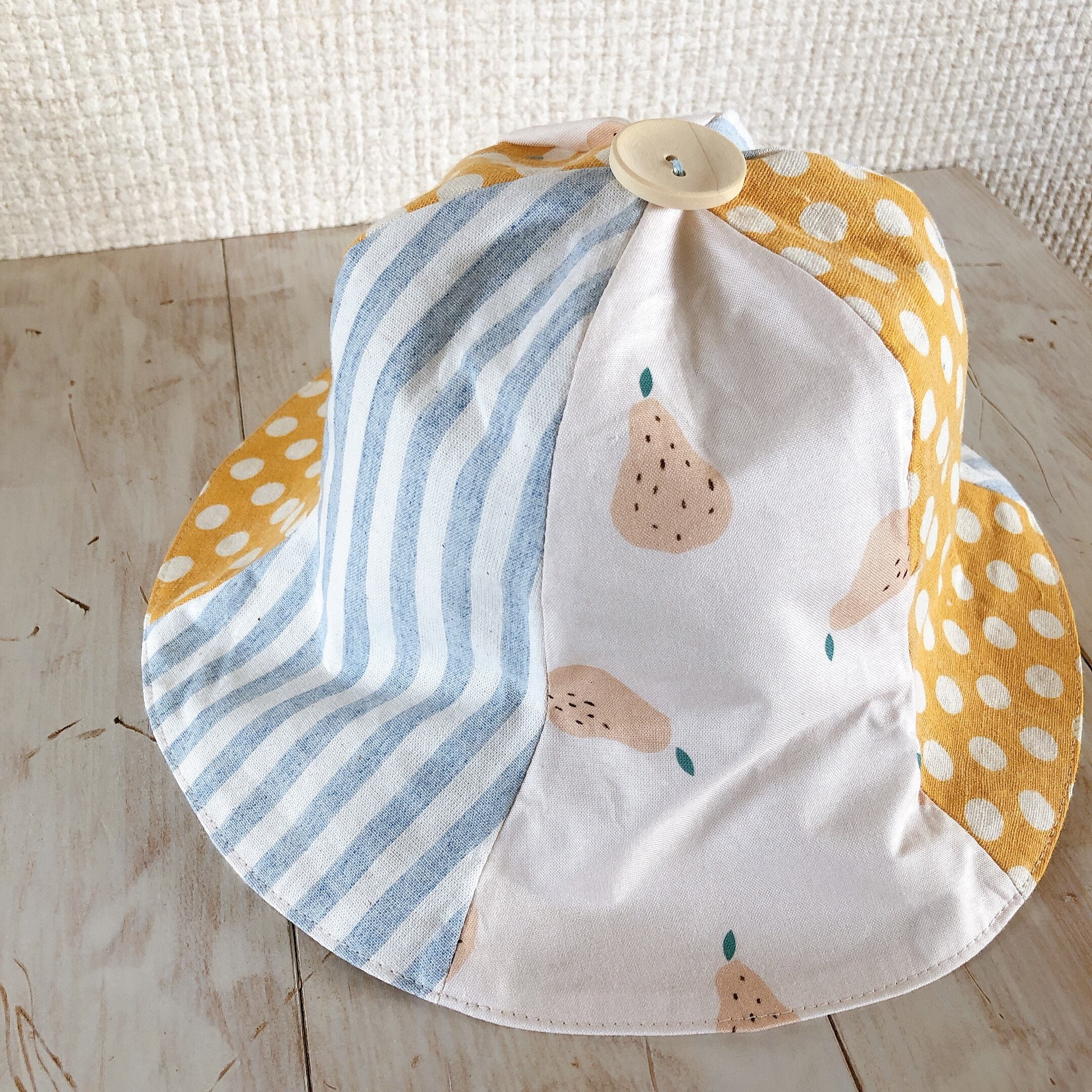 相性の良い3色の生地を組み合わせてチューリップハットにしました。
