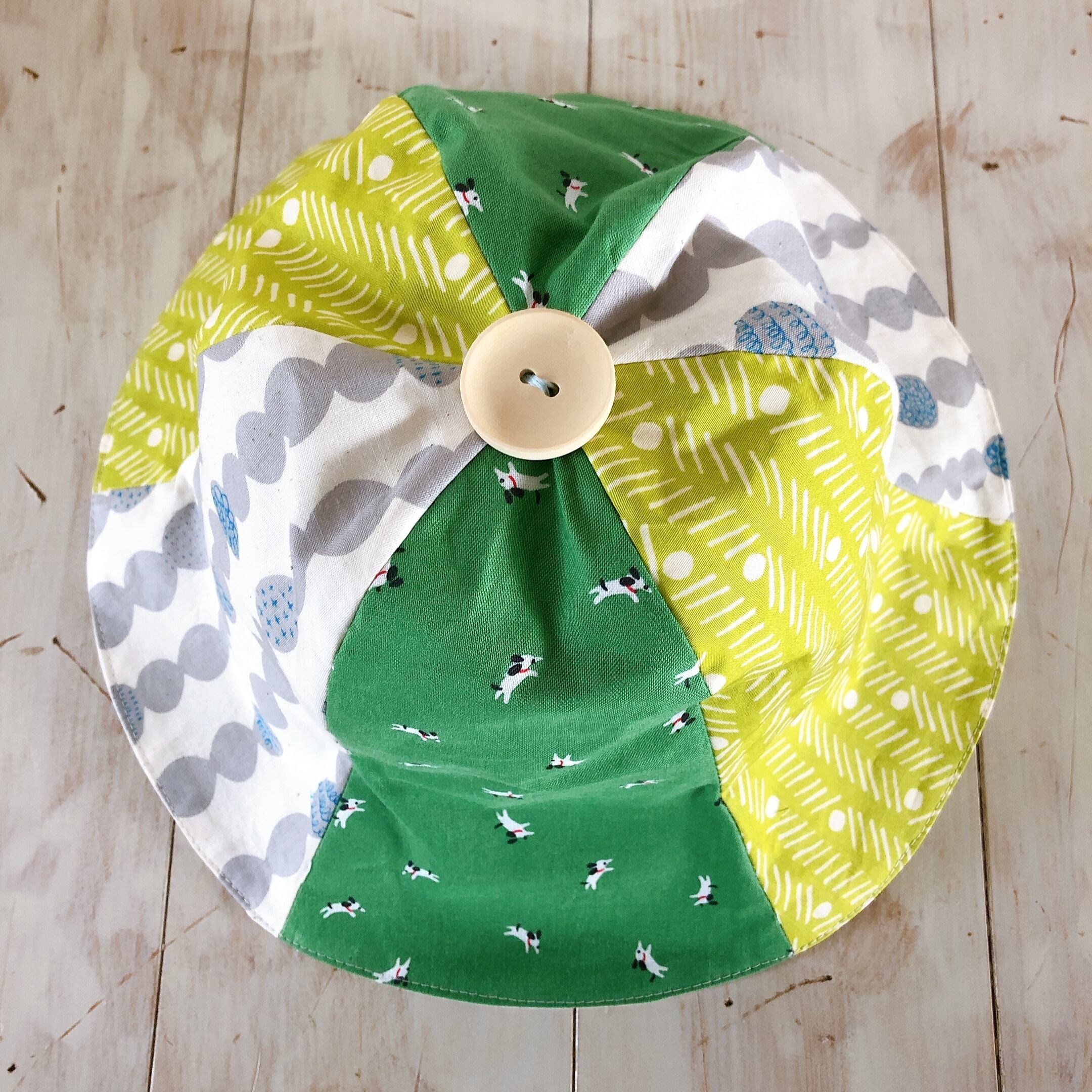 相性の良い3色の生地を組み合わせてチューリップハットにしました。