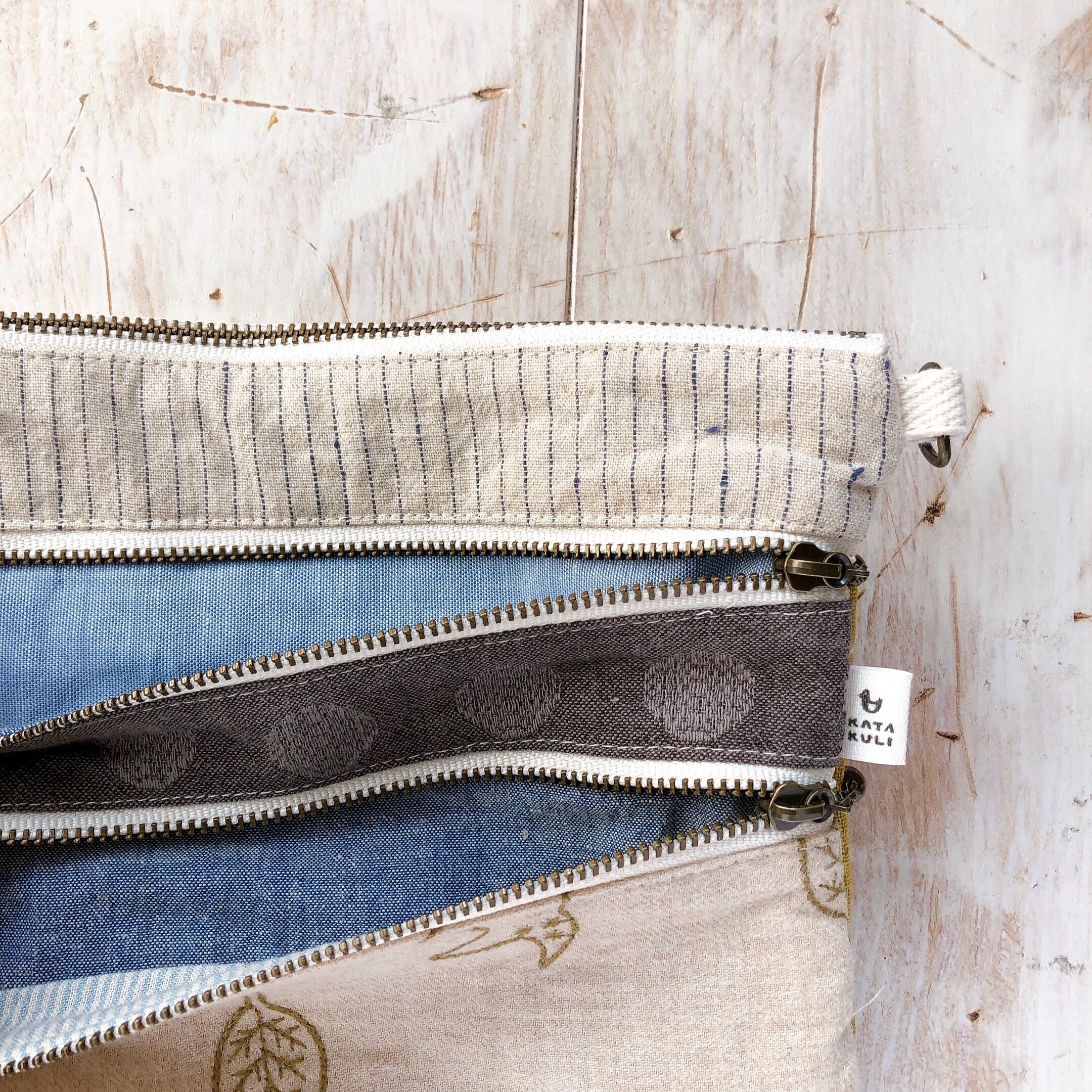 3ファスナーフラットポーチ(刺繍ツリー・ベージュ)マスク入れにも♪ポシェットにも♪