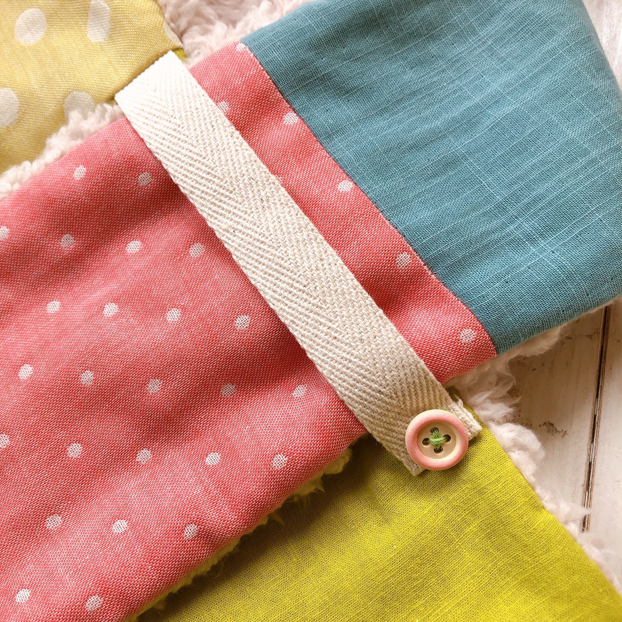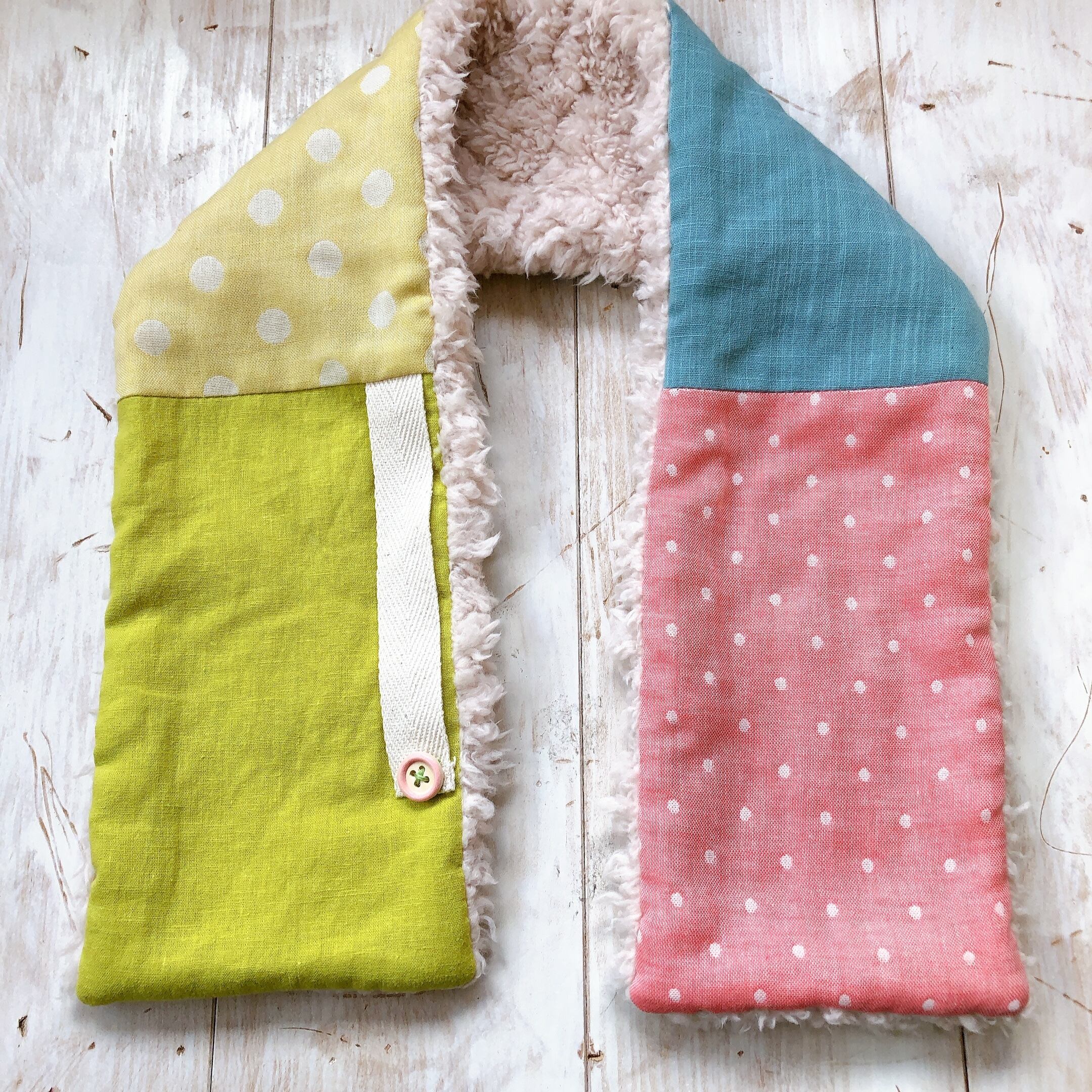 結んだりまいたりしない、テープにくぐらせる着脱楽ちんなショートマフラーです。