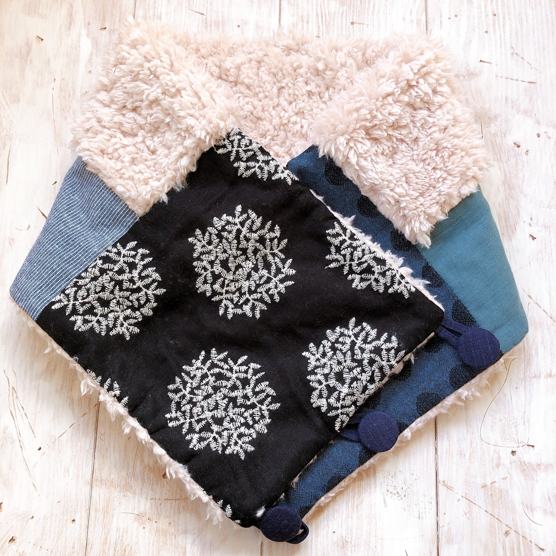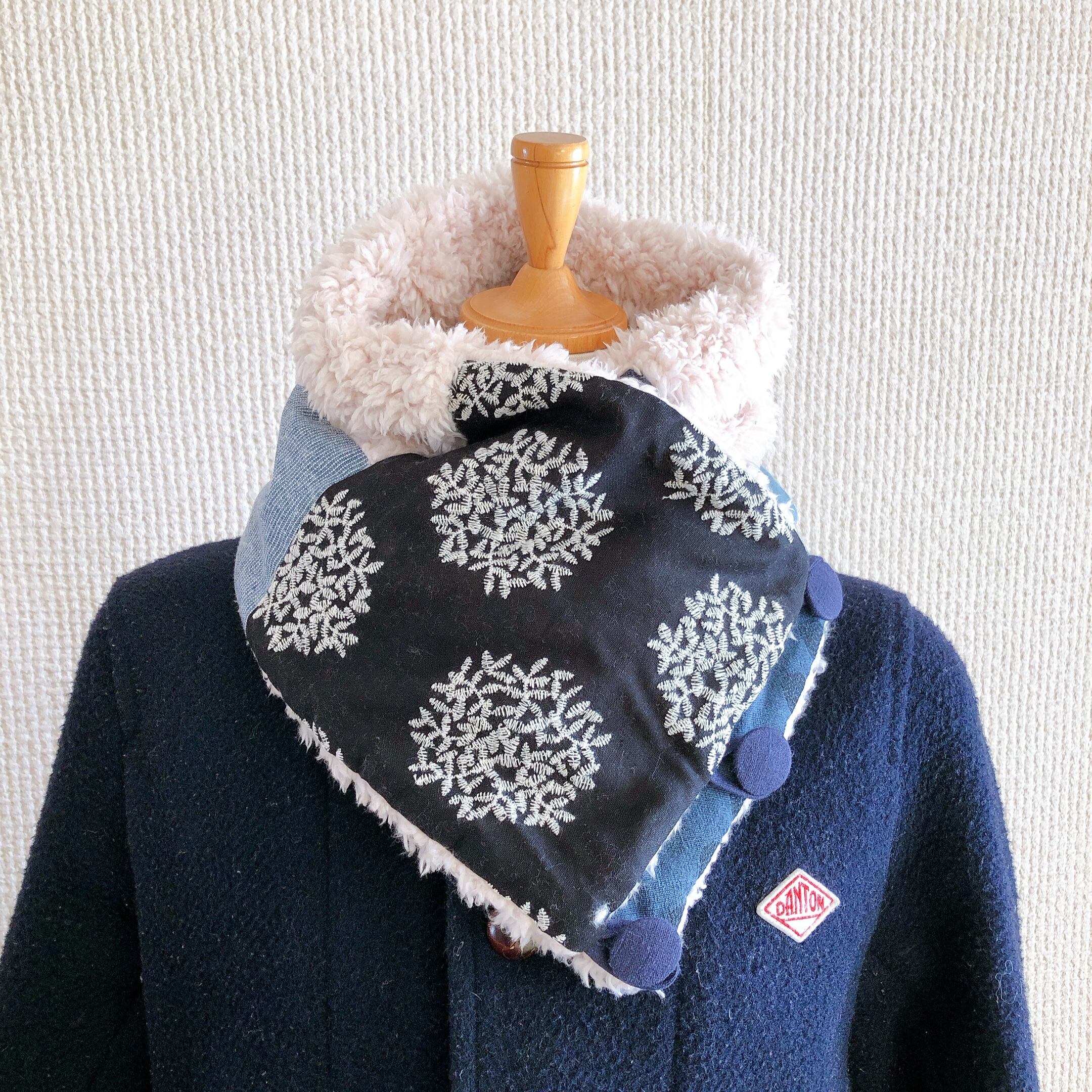 くるみボタンのあったかmixスヌード(刺繍あじさいブラック)