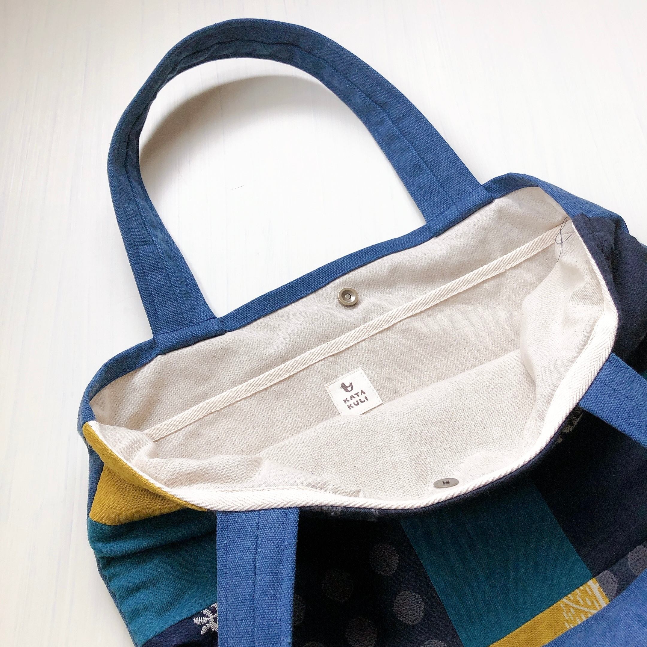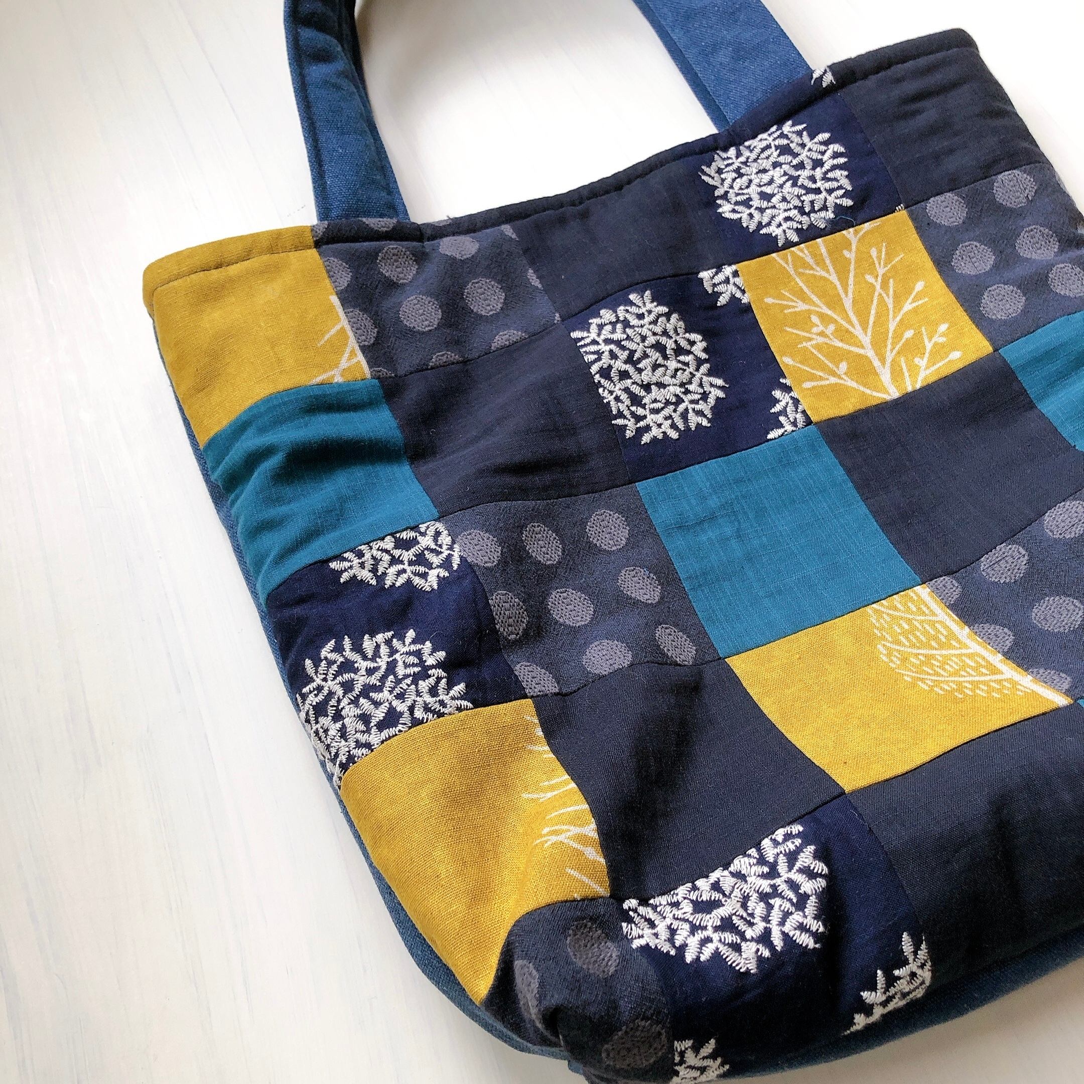パッチワークの大き目トートバック(ネイビー×カラシmix)
