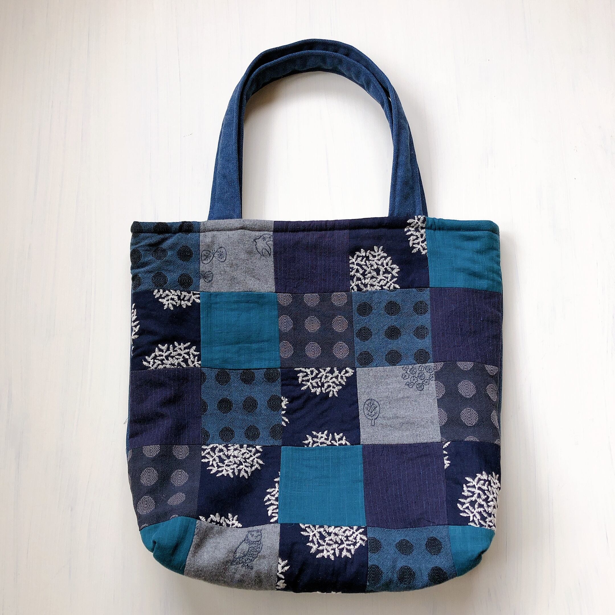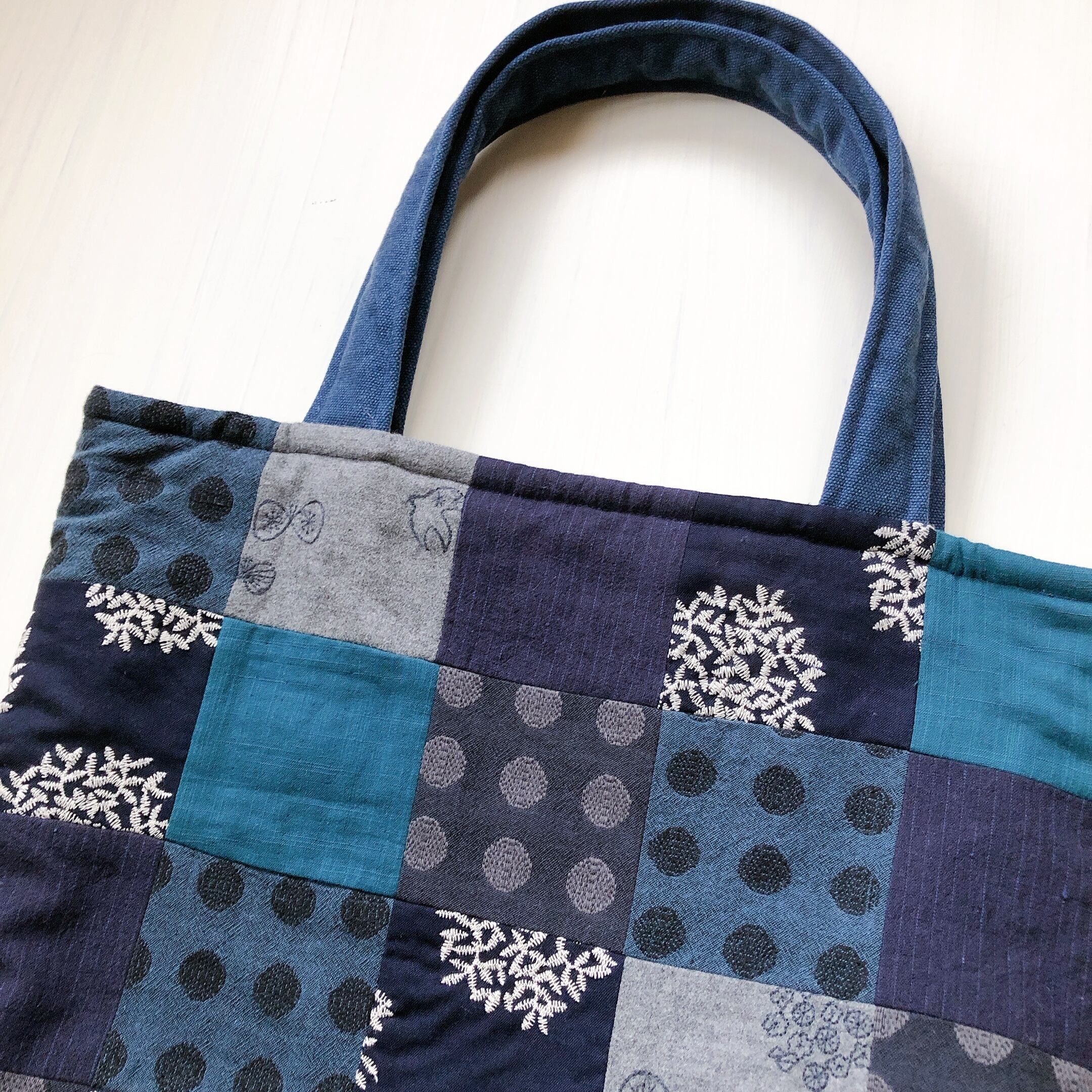 パッチワークの大き目トートバック(ネイビー×あじさいmix)