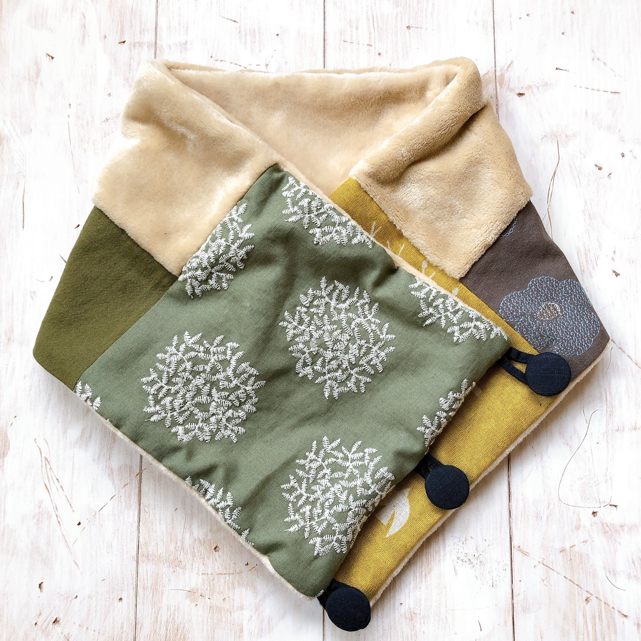 くるみボタンのあったかmixスヌード(刺繍あじさいカーキ)