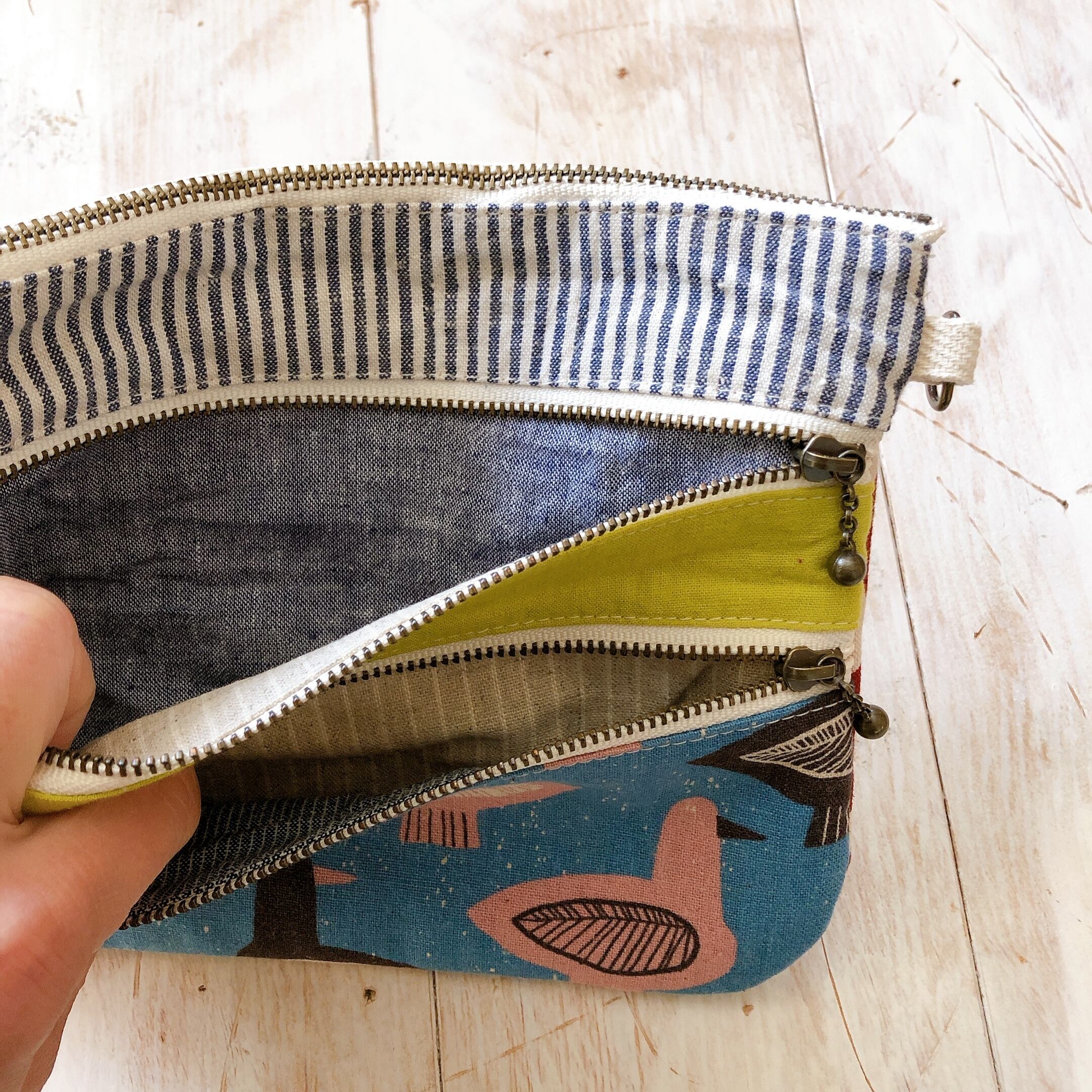 3ファスナーフラットポーチ(ピンクバード)マスク入れにも♪ポシェットにも♪