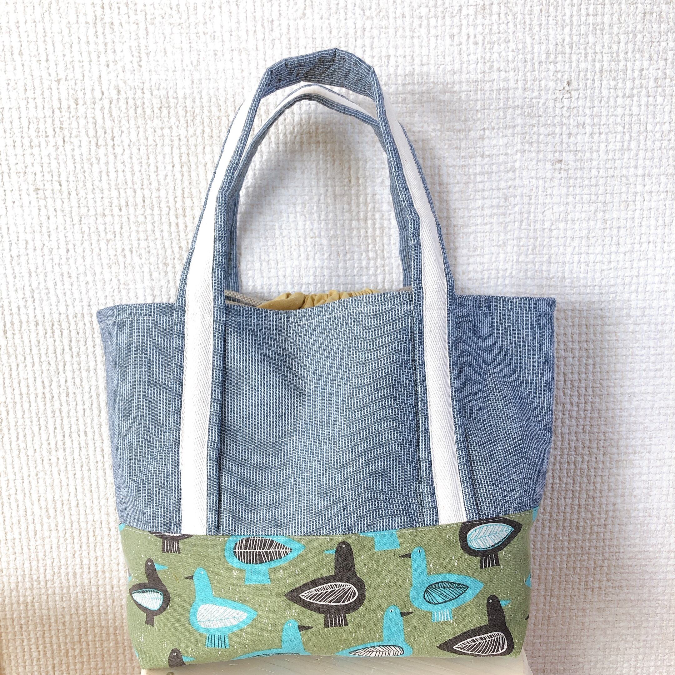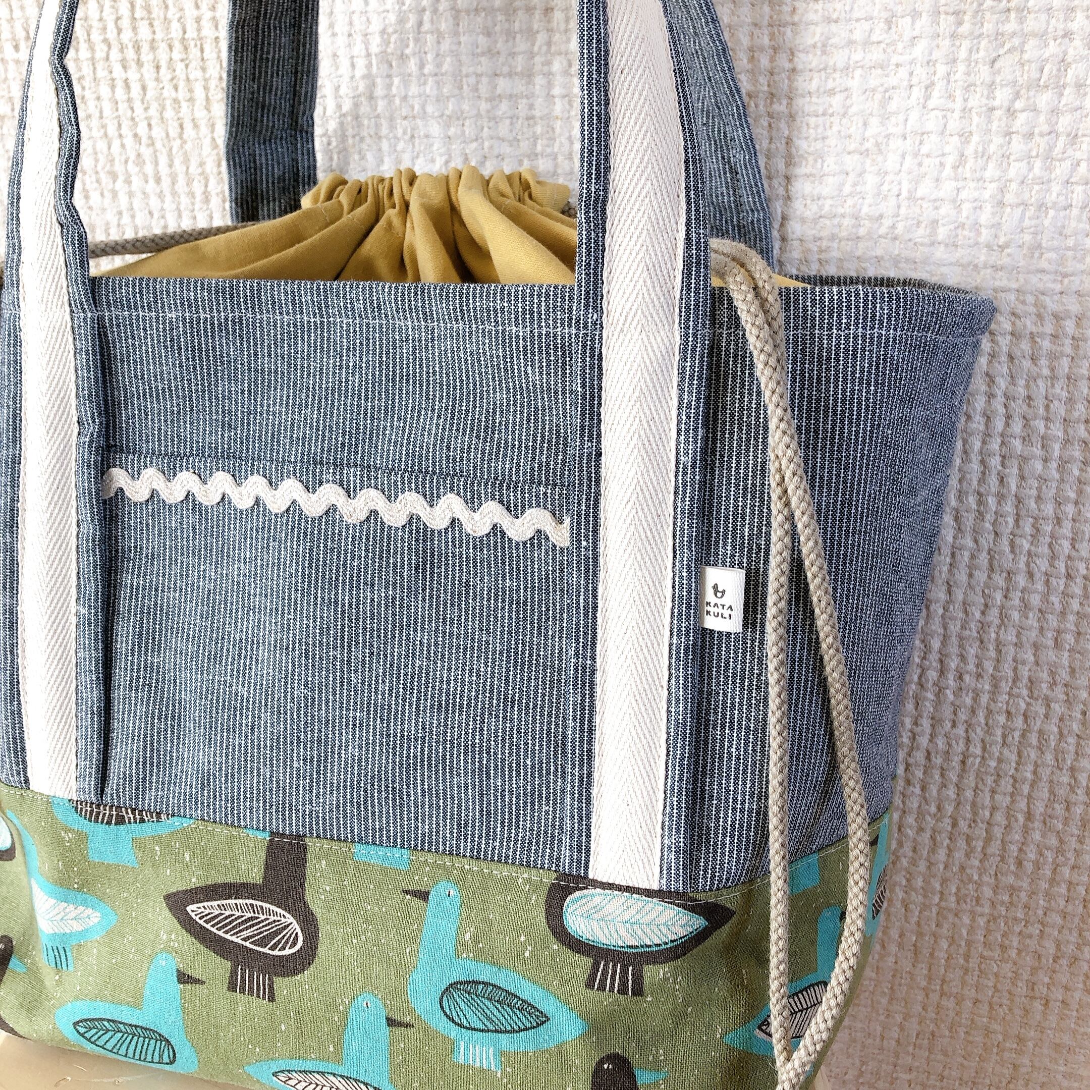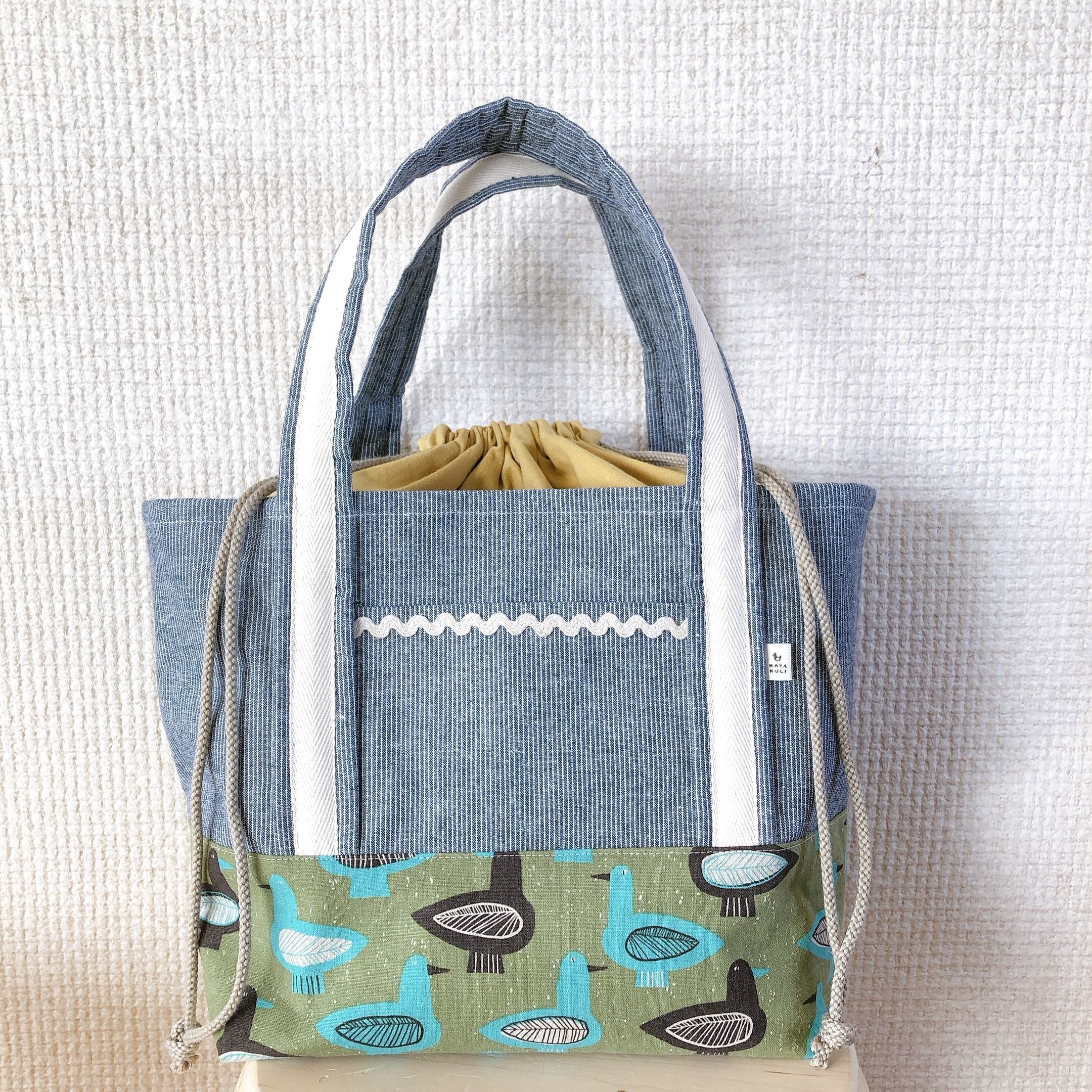 トート下部分の柄生地は綿麻の生地に接着芯を張って強度を強めています。