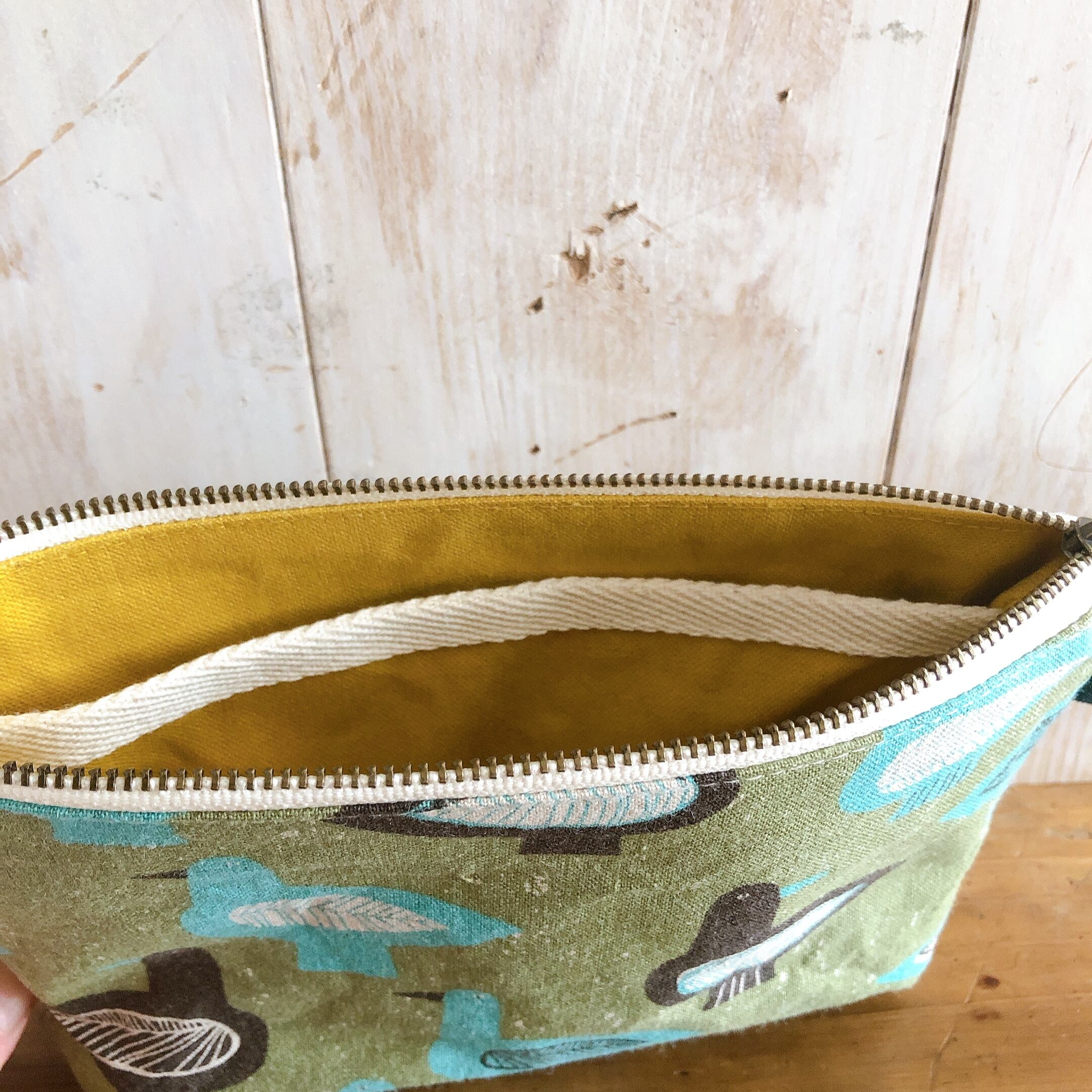 仕切りのあるポーチ(カーキバード×カラシドット)