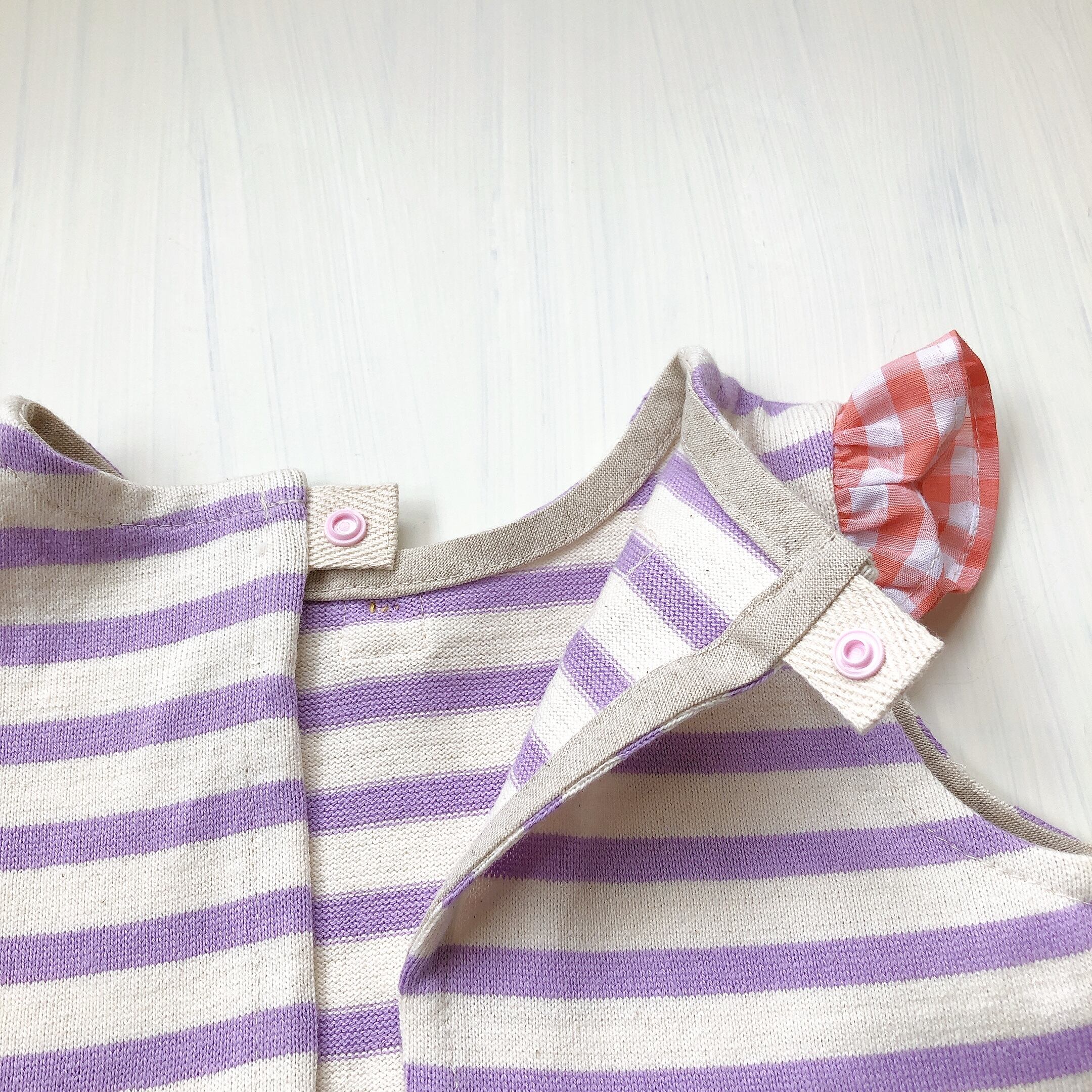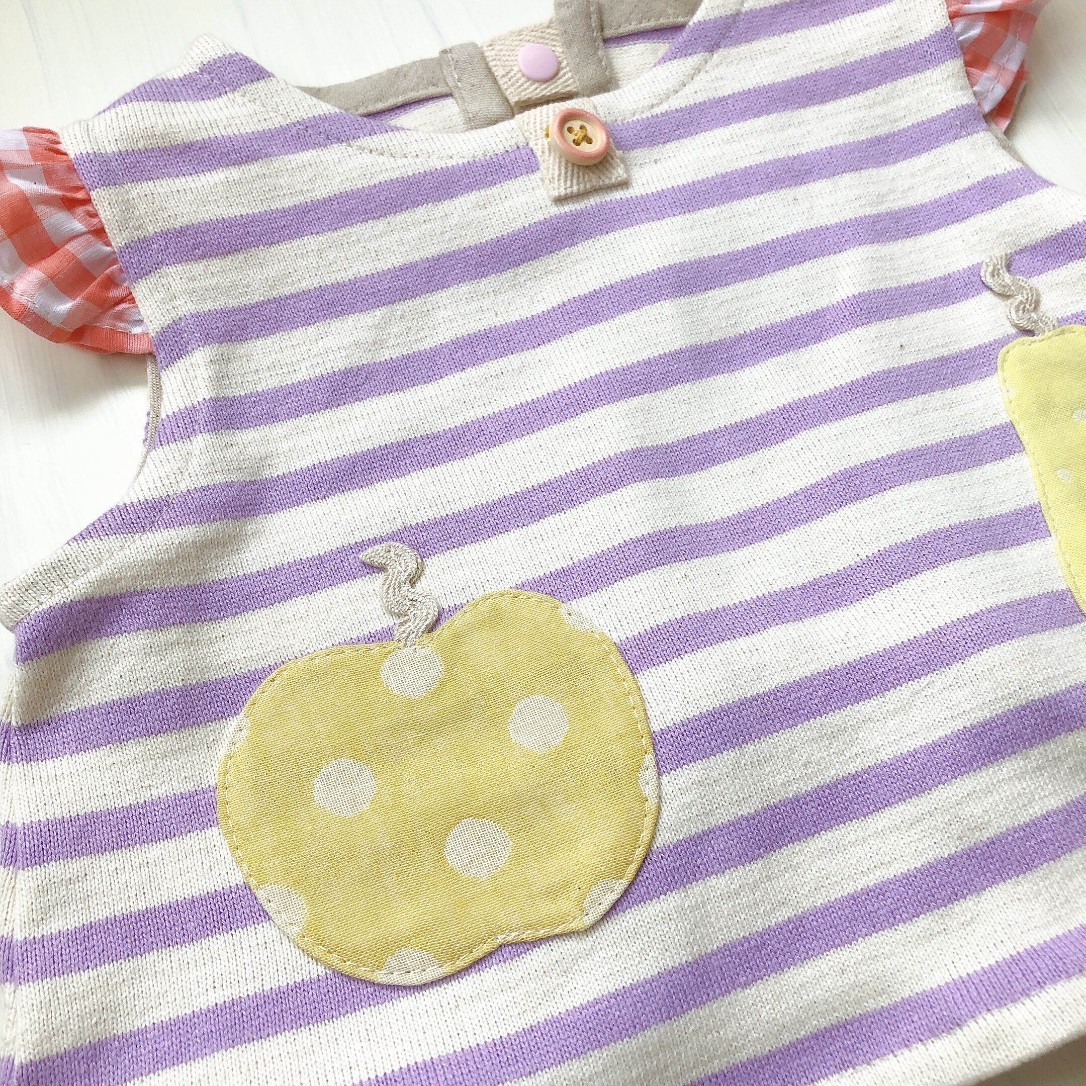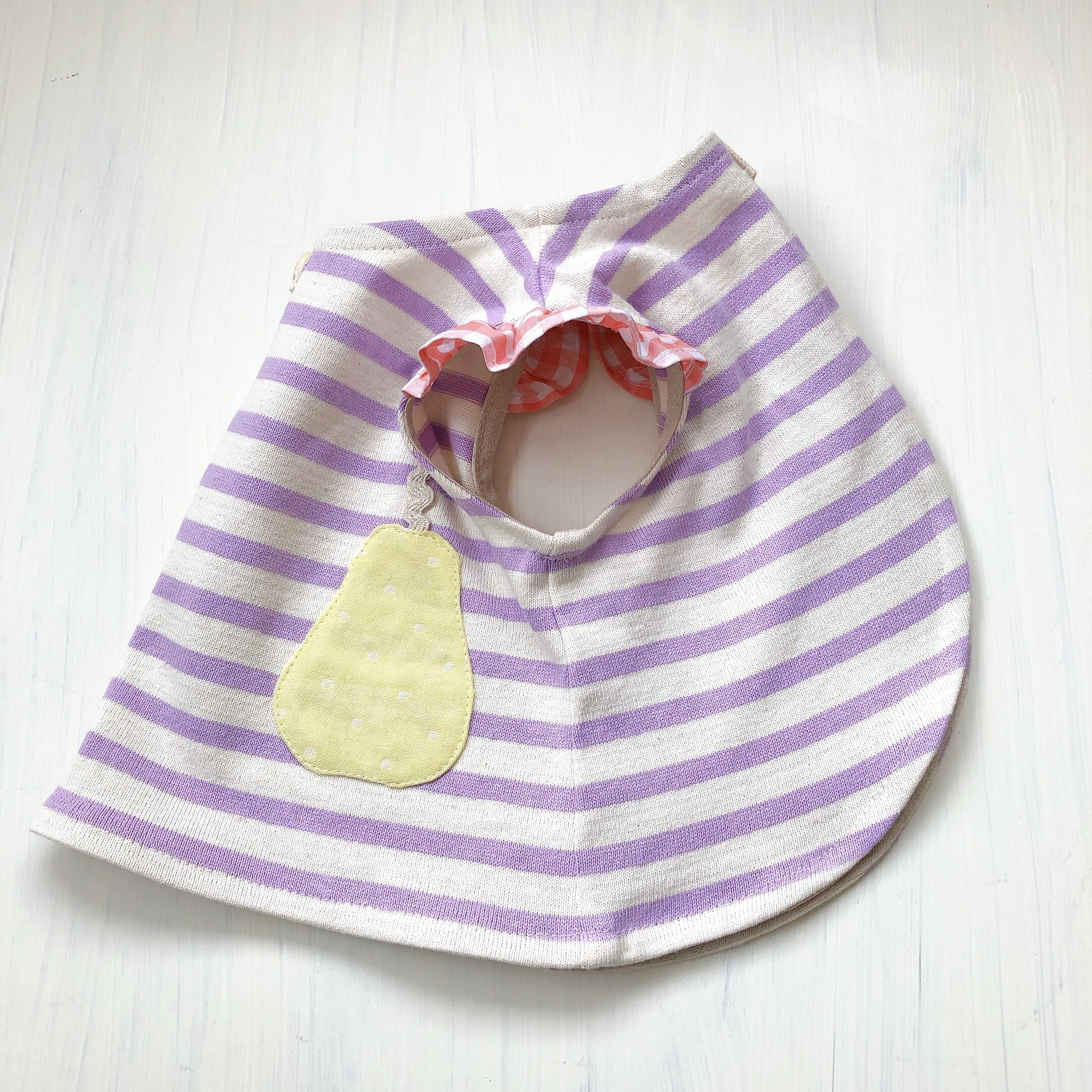 赤ちゃんエプロンベスト(ラベンダーストライプ・洋ナシリンゴ)・サイズ80くらい